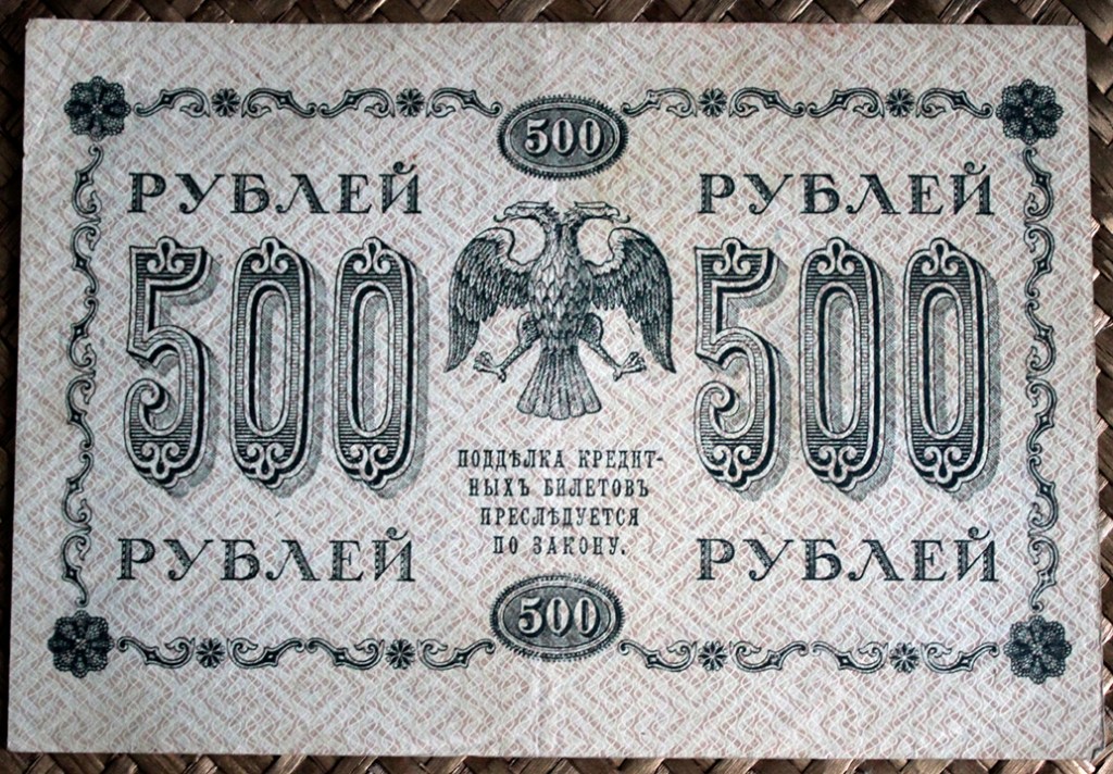 El ejemplar de 500 rublos de la RSFSR de 1918 ofrece grabados en tono verde oliva al anverso y gris al reverso. Su papel es de color verde oliva claro.