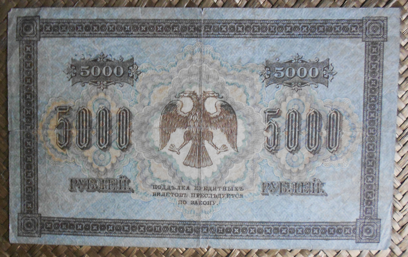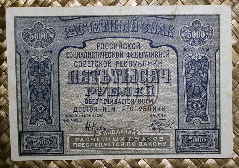 El ejemplar de 5.000 rublos de la RSFSR de 1918 ofrece grabados en gris al anverso y en marrón al reverso; papel de cromaticidad predominante azulada con mezcla de amarillos, rosas y verdes en sus figuras cicloidales.