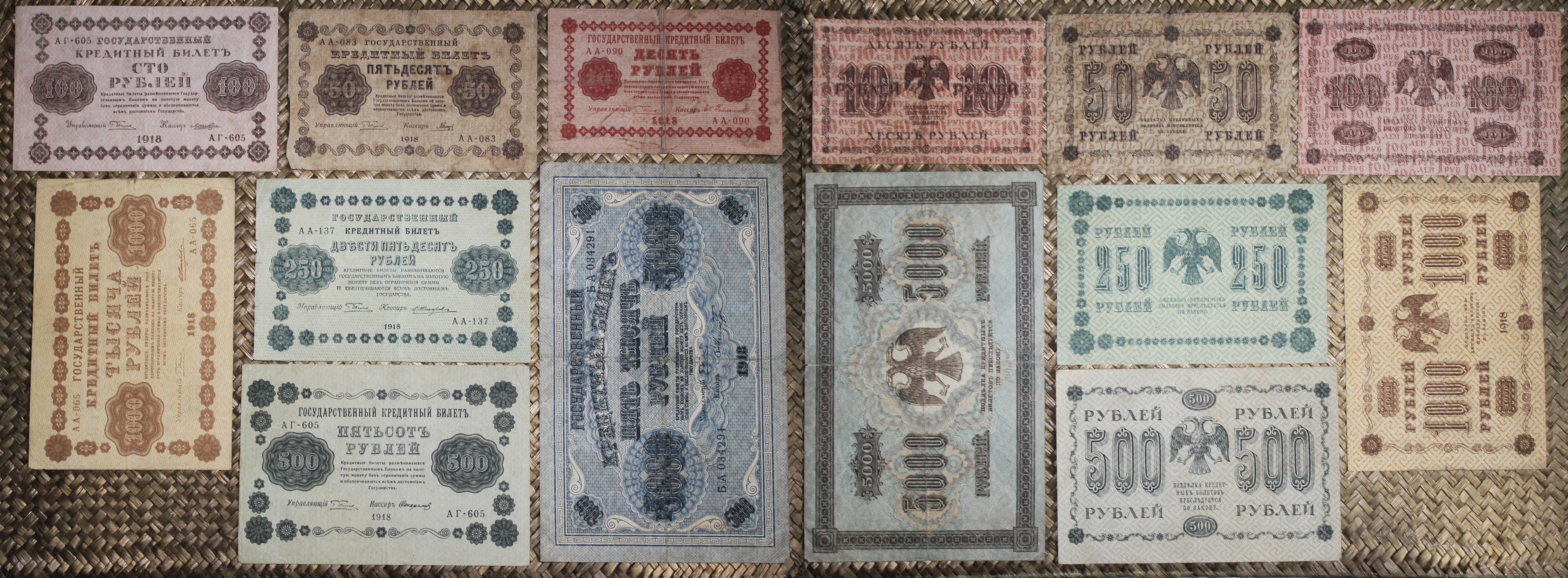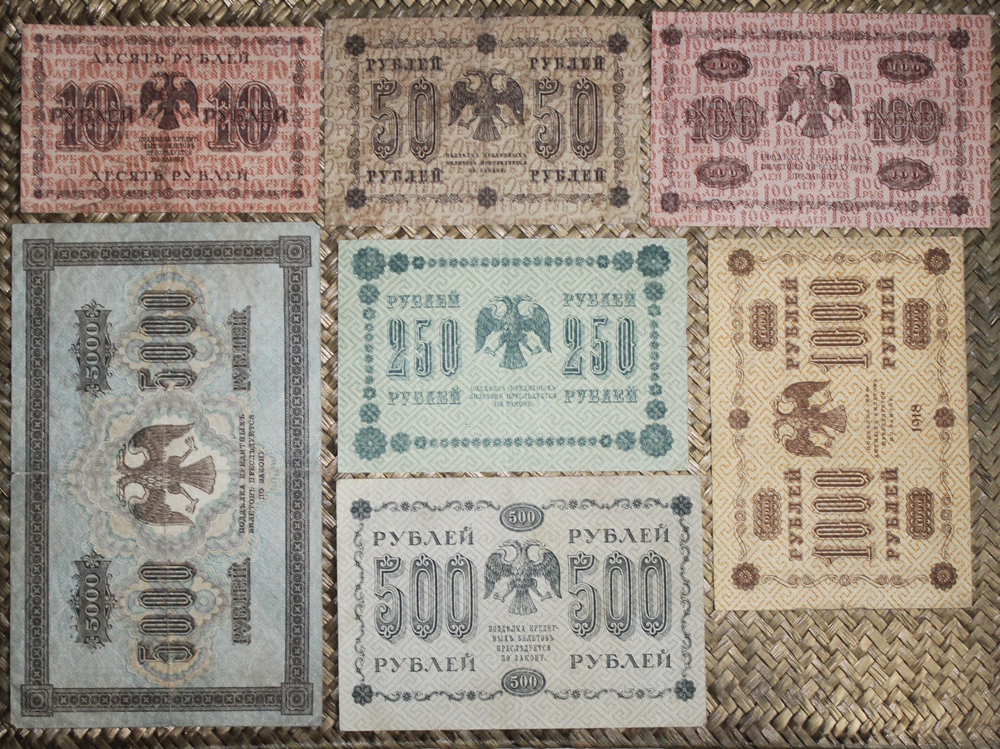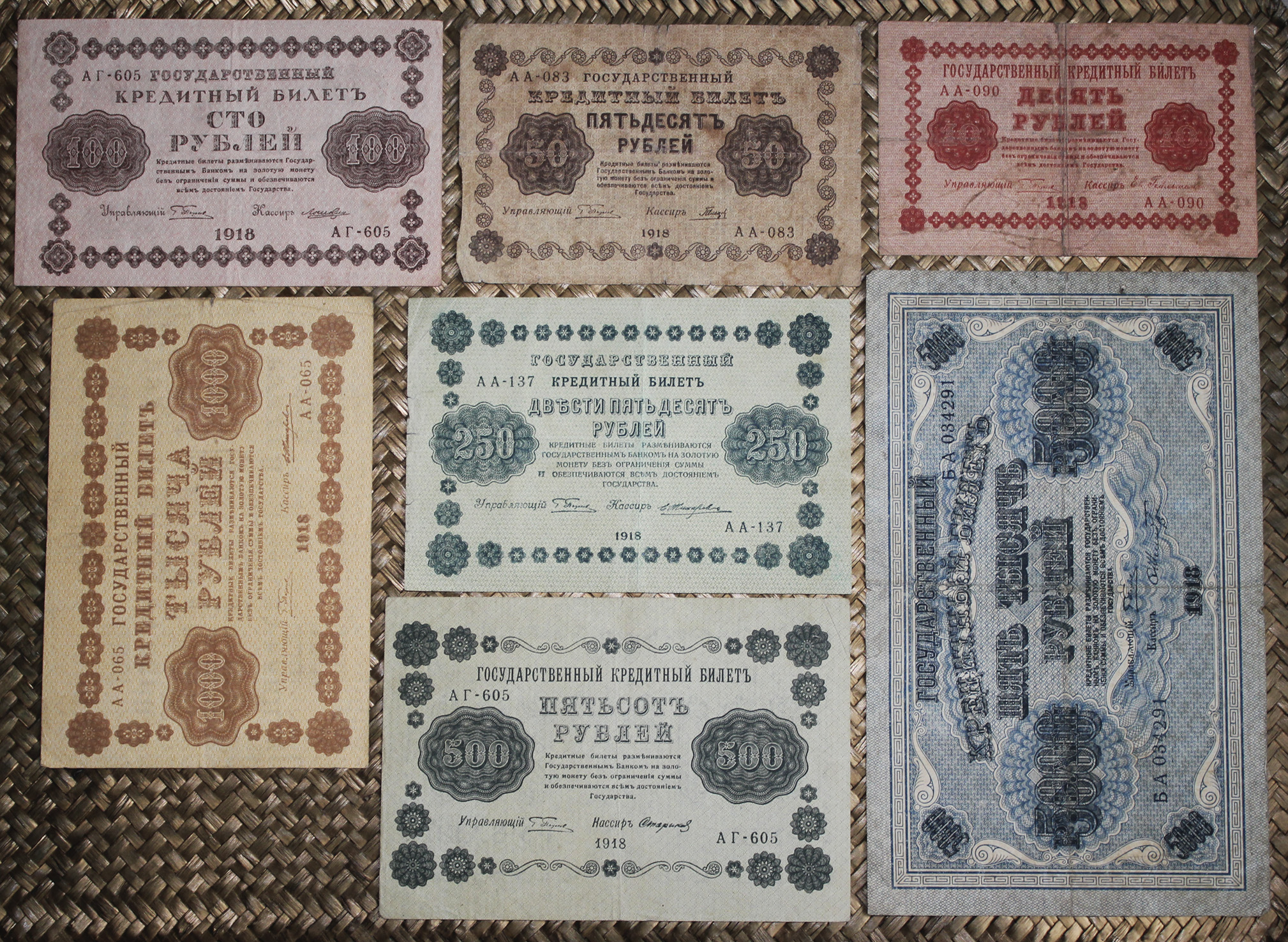Contemplaremos los billetes de 10 rublos, 50 rublos, 100 rublos, 250 rublos, 500 rublos, 1.000 rublos y 5.000 rublos de la R.S.F.S.R. de 1918.