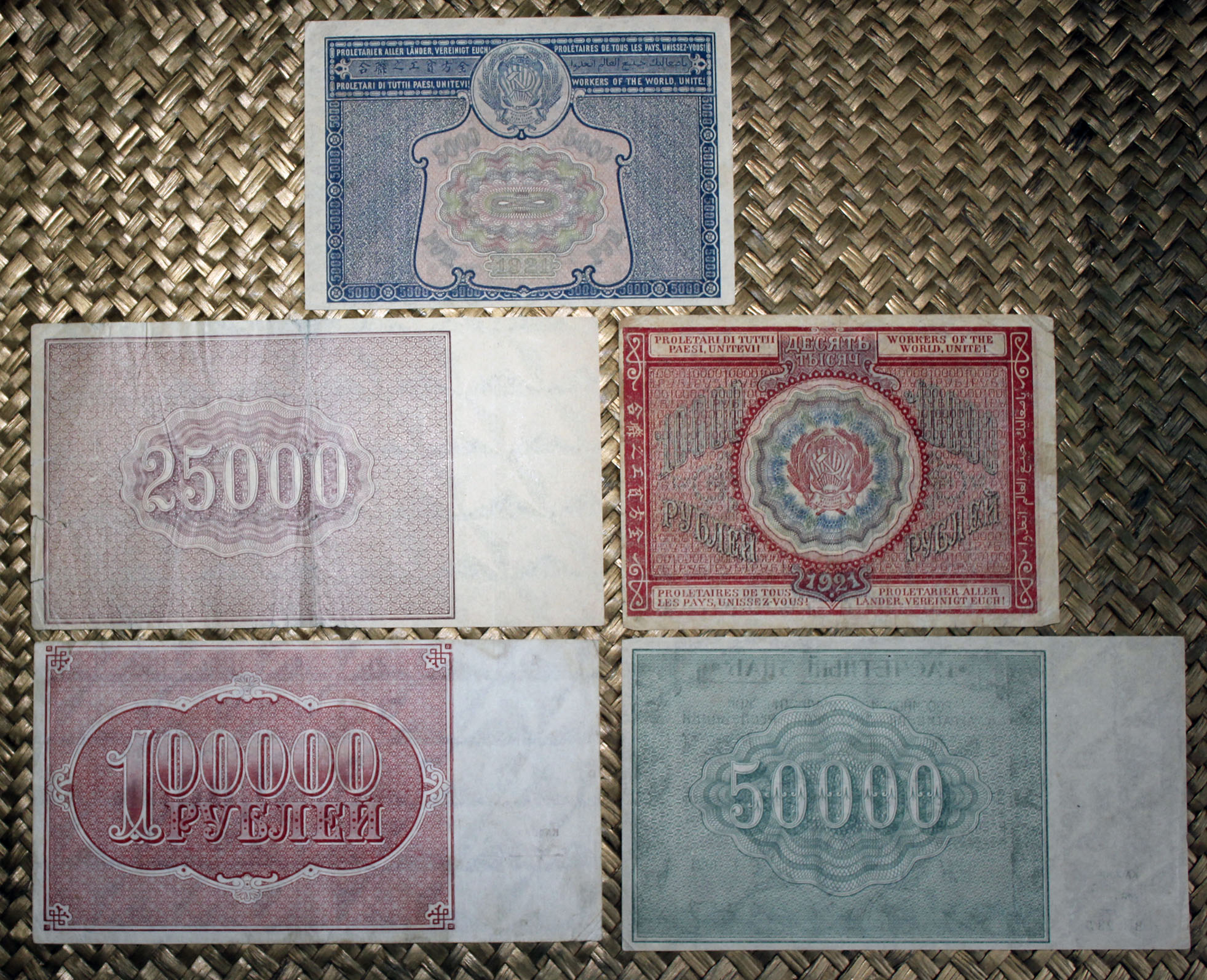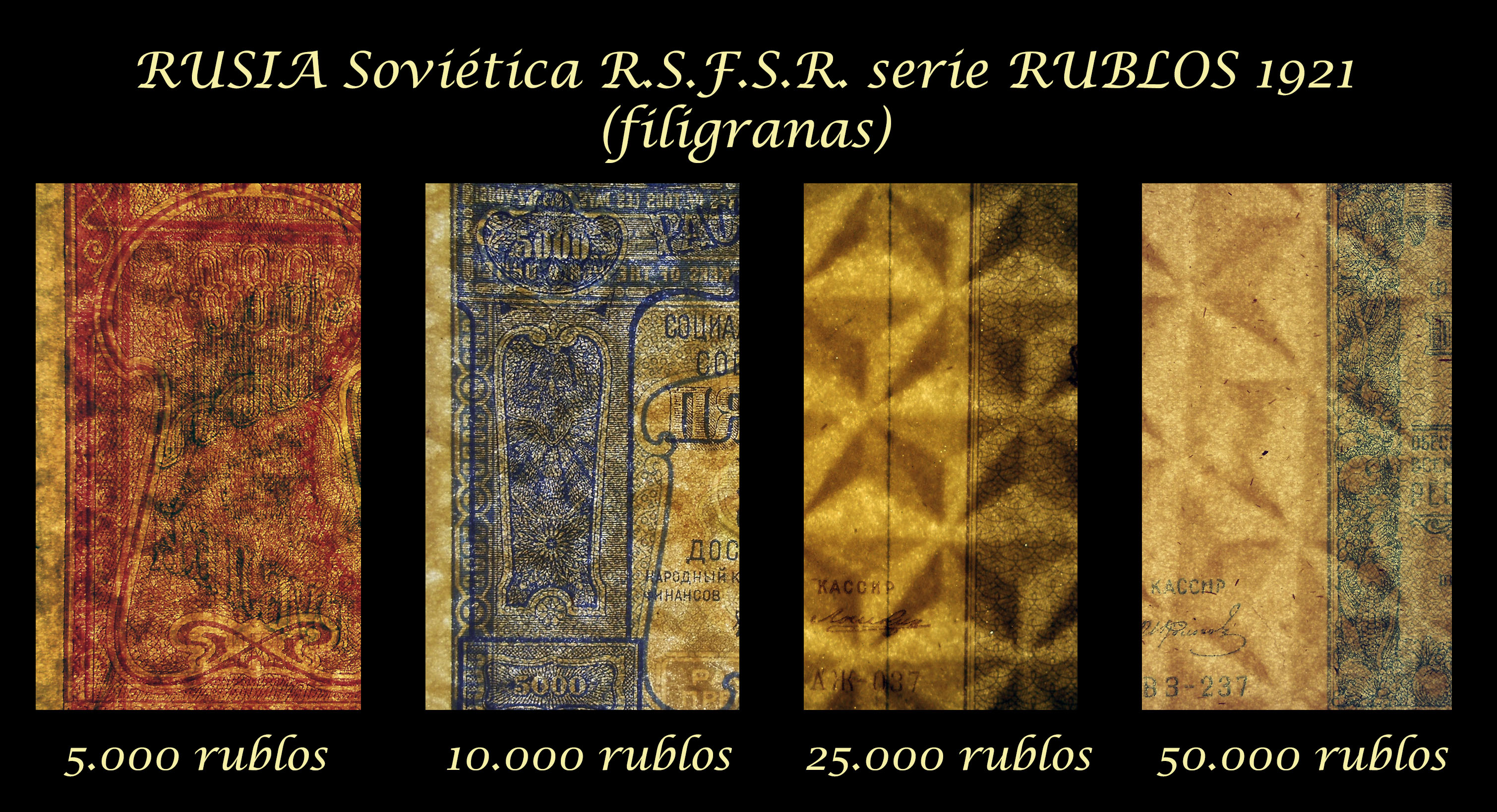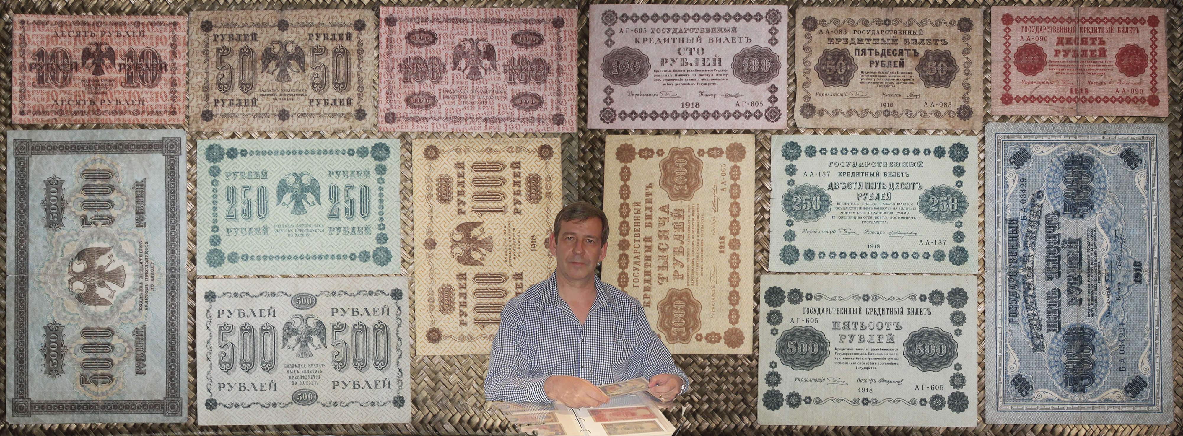 Contemplaremos los billetes de 10 rublos, 50 rublos, 100 rublos, 250 rublos, 500 rublos, 1.000 rublos y 5.000 rublos de la R.S.F.S.R. de 1918.