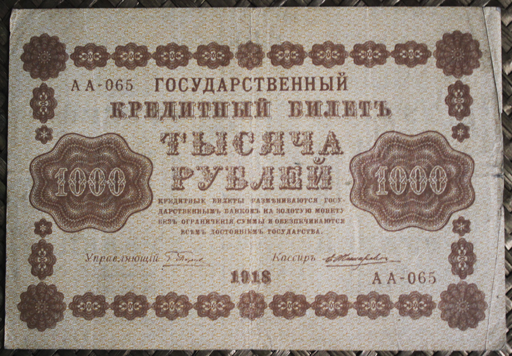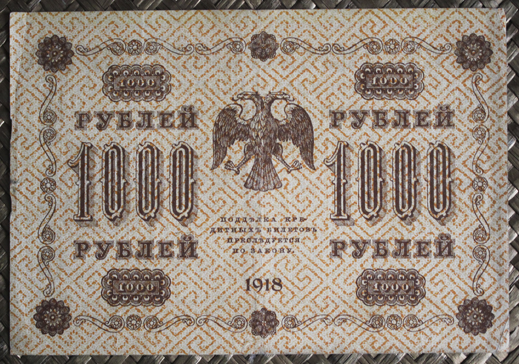 El billete de 1.000 rublos de la RSFSR de 1918 muestra grabados en marrón sobre papel amarillo crema.