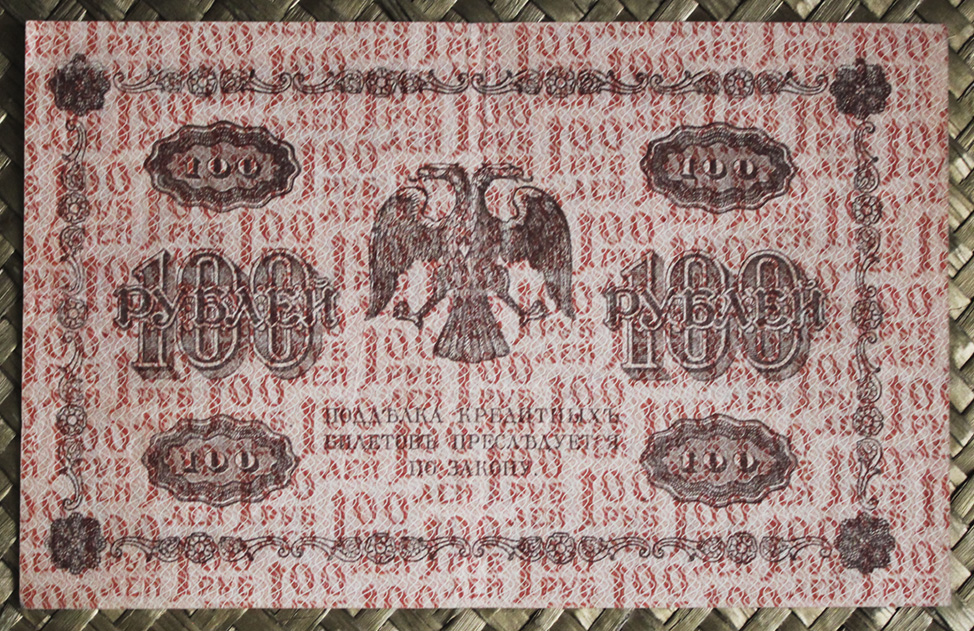 El billete de 100 rublos de la RSFSR de 1918 ofrece grabados en tonos marrones ambos lados en papel color rosa claro.