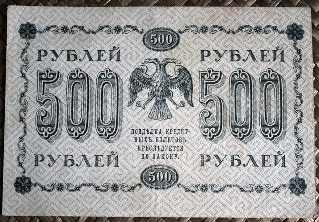 El ejemplar de 500 rublos de la RSFSR de 1918 ofrece grabados en tono verde oliva al anverso y gris al reverso. Su papel es de color verde oliva claro.