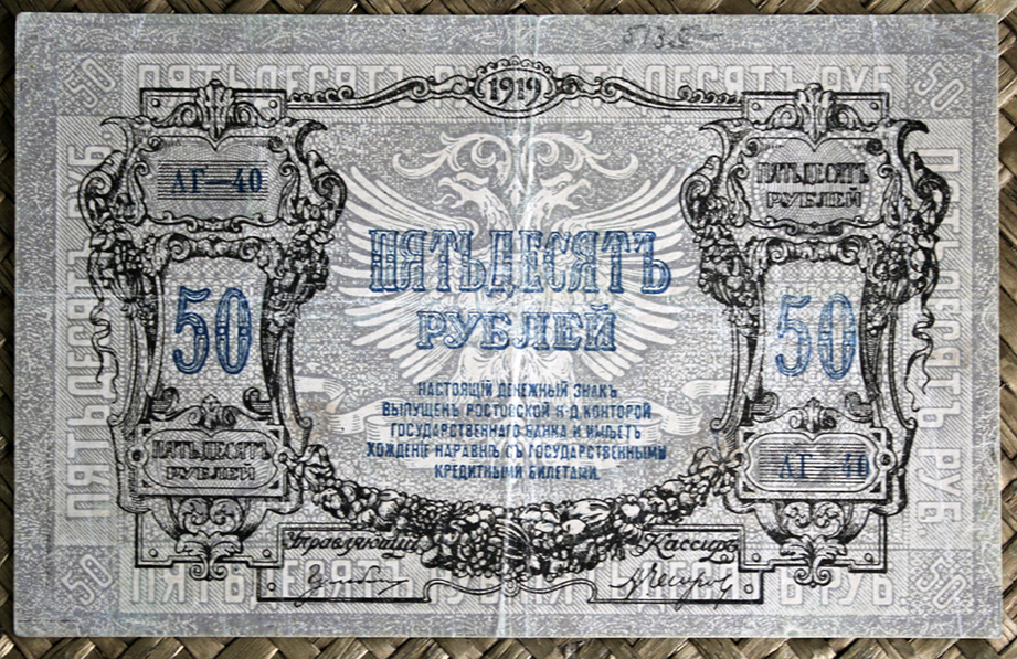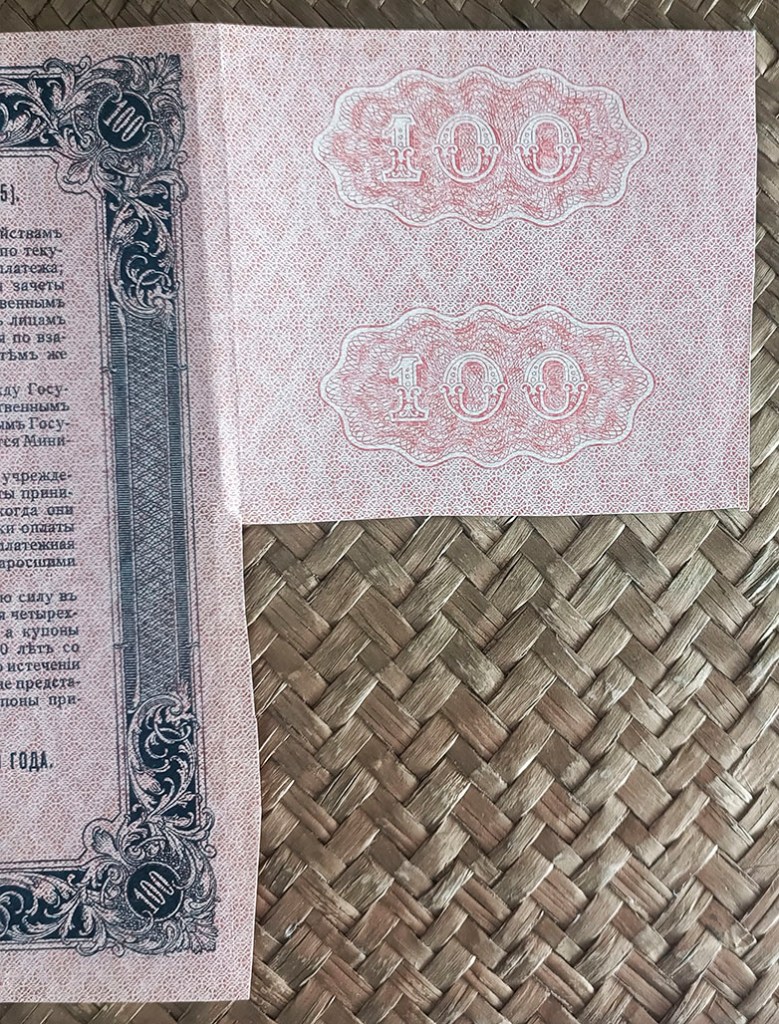 Los billetes o notas del Tesoro del Estado (BGK) se pusieron en circulación en enero de 1918 (Decreto del Comité Ejecutivo Central de Rusia del 21 de enero). Se habían emitido en los valores de 25 rublos (cartela de año 1915), 50 rublos (cartelas de años 1908, 1912, 1913, 1914 o 1915), 100 rublos (cartelas de años 1908, 1912, 1913, 1914 o 1915) y 500 rublos (cartelas de años 1915 o 1916). Las cartelas, que mostraban el año en ambas ramas laterales de la ornamentación floral, nos indicarían la fecha de inicio del devengo de intereses. En la cartela al pie del anverso quedaba indicada la fecha de redención o rescate por vencimiento del titulo nominal.