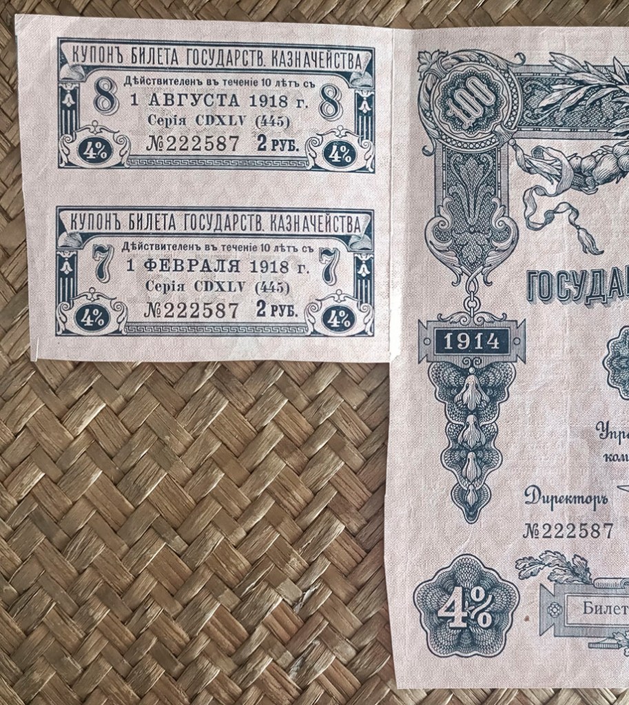Estas notas llevaban en su matriz izquierda ocho cupones de vencimiento semestral y valor (el correspondiente a ese 4% de interés aplicado al nominal de la nota y al semestre de amortización). En el ejemplo anterior se pueden leer los únicos dos cupones aún no amortizados, de 2 rublos (4% de 100 rublos en seis meses), correspondientes a febrero 1918 (cupón nº7) y agosto 1918 (cupón nº8) del ejemplar de 100 rublos de 1914 revisado.