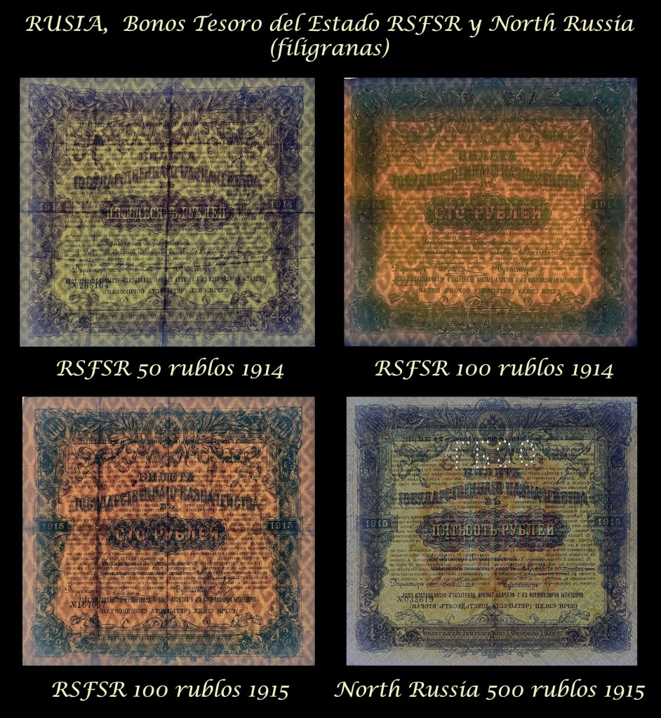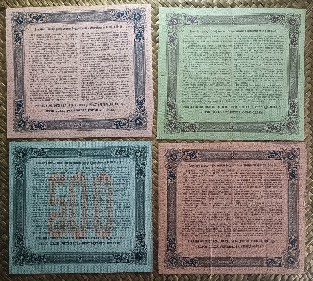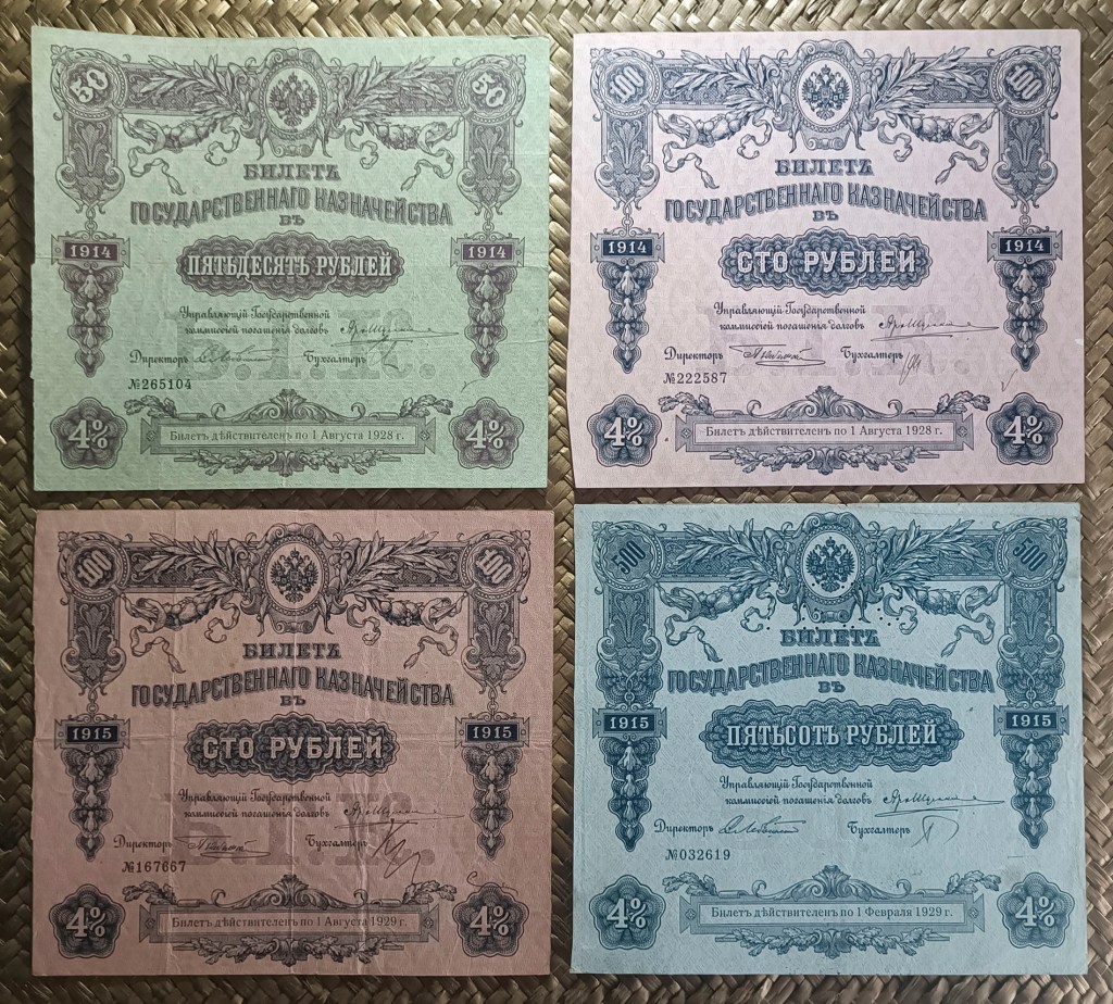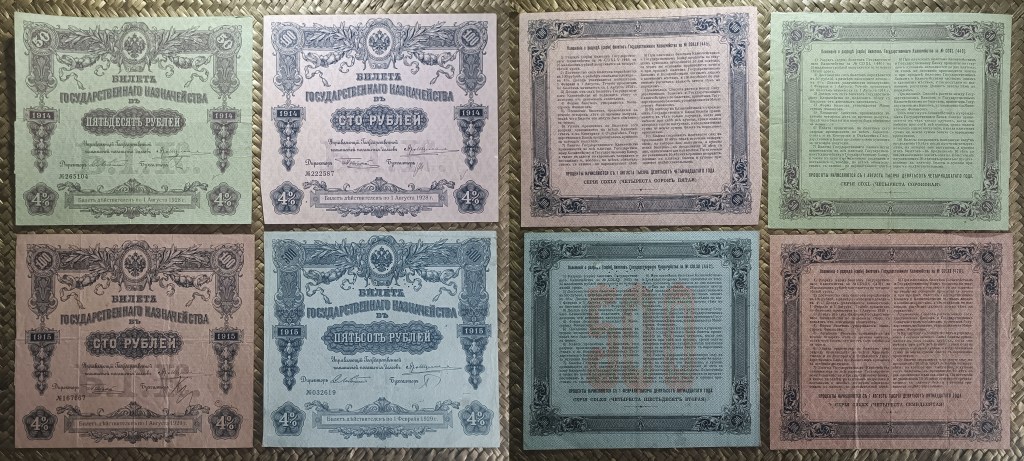 Revisaremos los Bonos del Tesoro Estatal de 50 rublos de 1914, de 100 rublos de 1914 y 1915 y de 500 rublos de 1915. En su diseño todos presentaban un artístico anverso con una cinta superior de ornamentación floral presidida por un medallón central con el escudo imperial ruso del águila bicéfala.