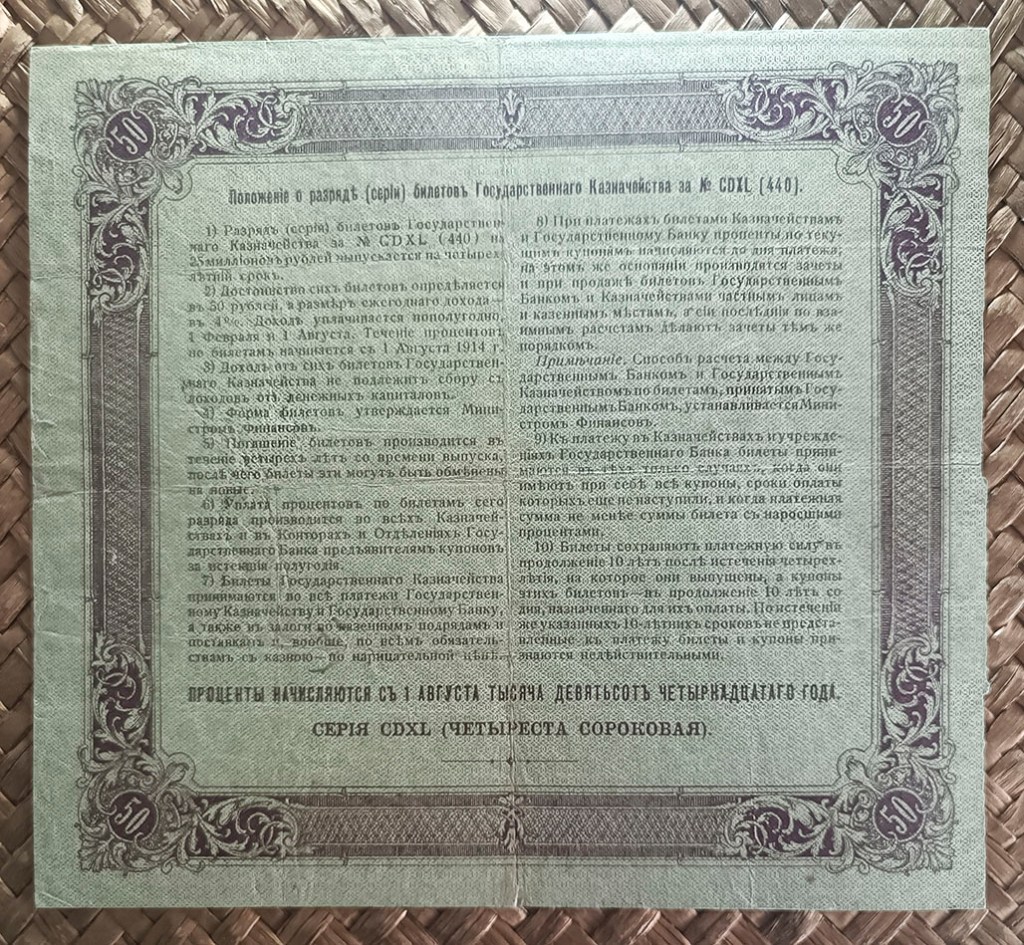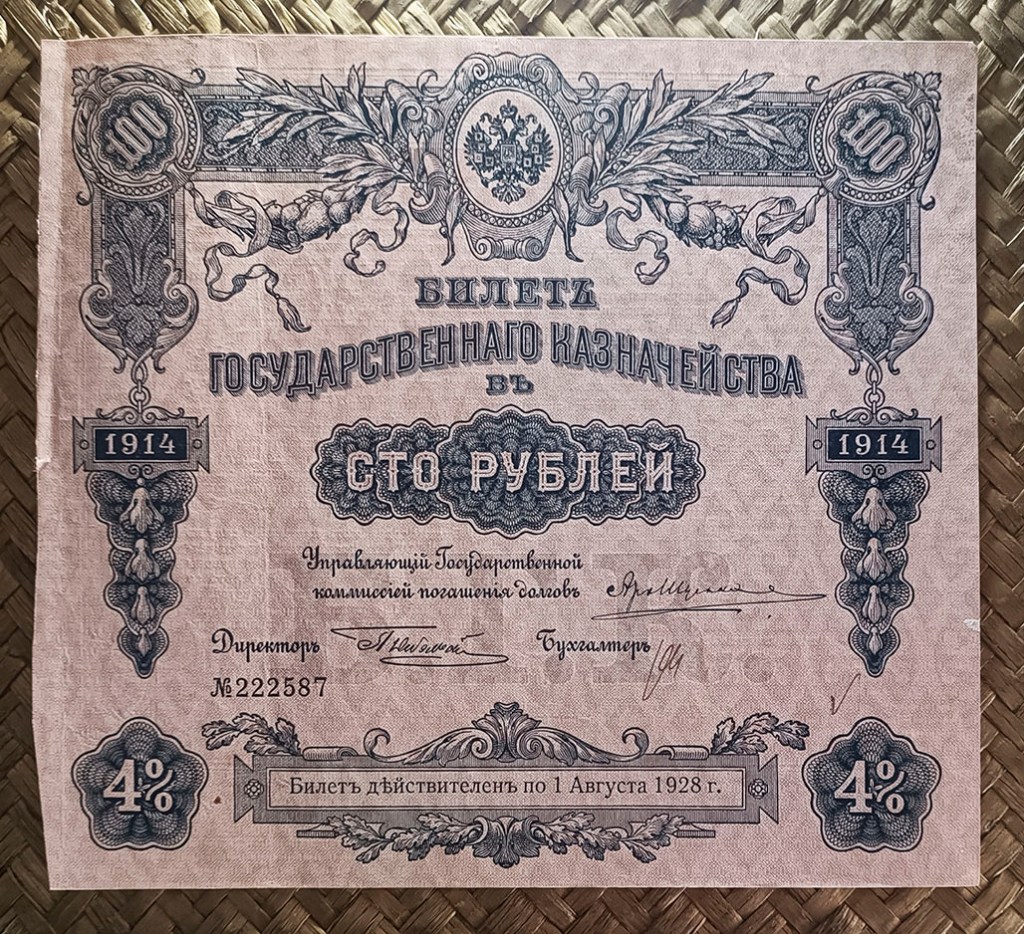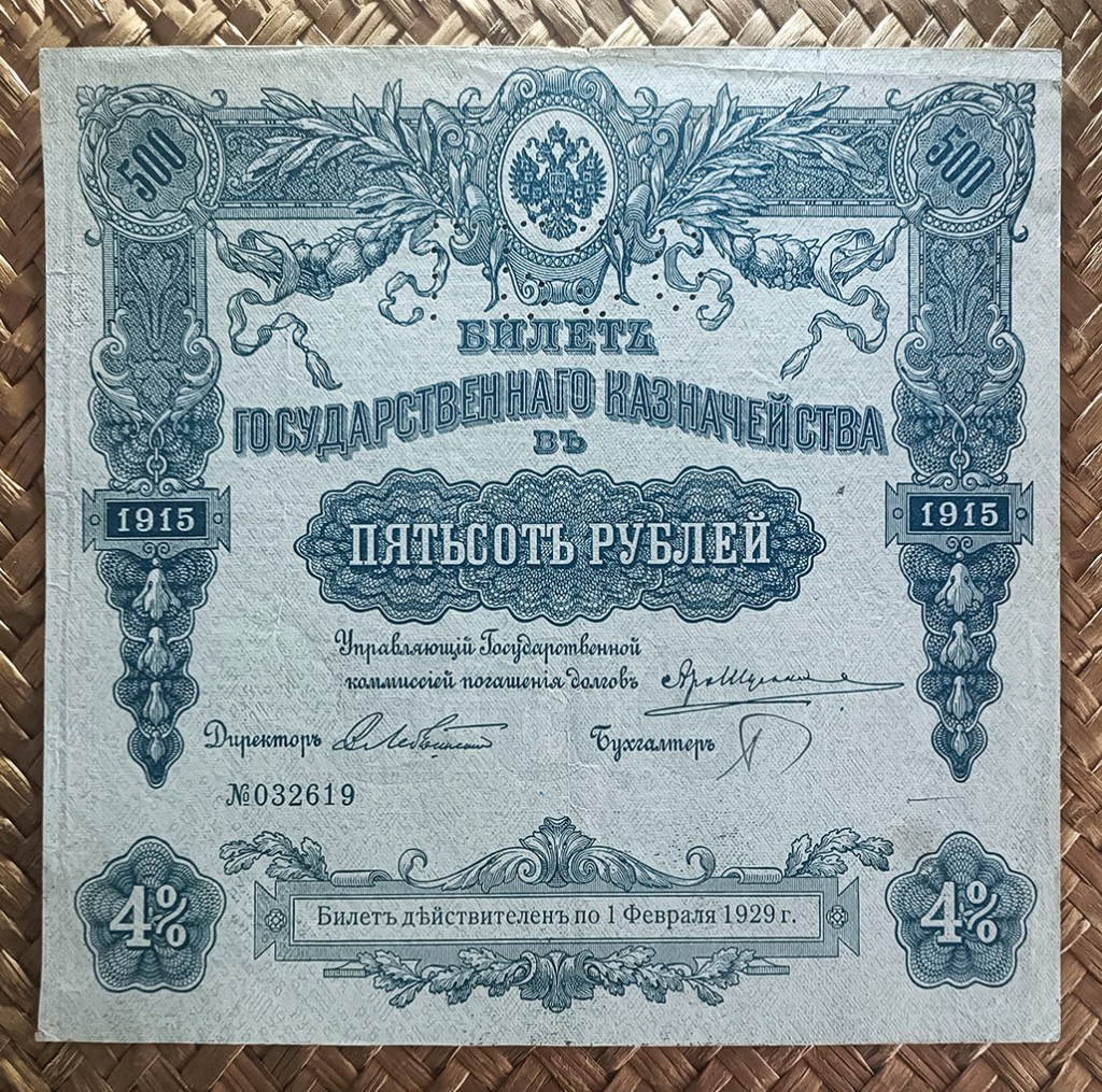 Revisaremos los Bonos del Tesoro Estatal de 50 rublos de 1914, de 100 rublos de 1914 y 1915 y de 500 rublos de 1915. En su diseño todos presentaban un artístico anverso con una cinta superior de ornamentación floral presidida por un medallón central con el escudo imperial ruso del águila bicéfala.