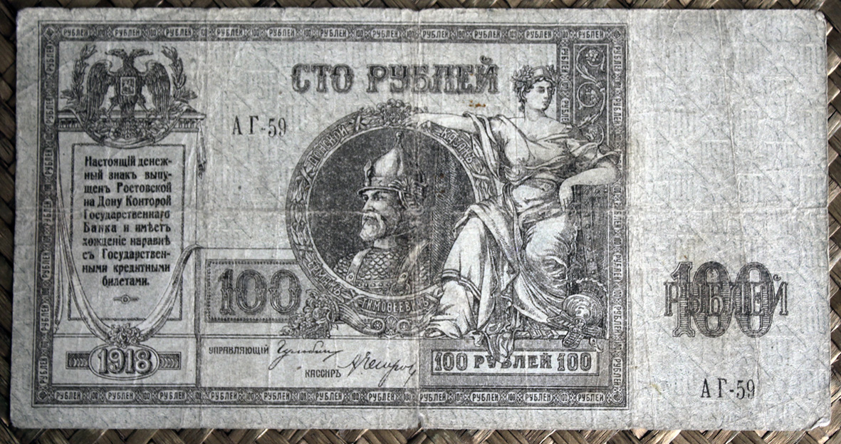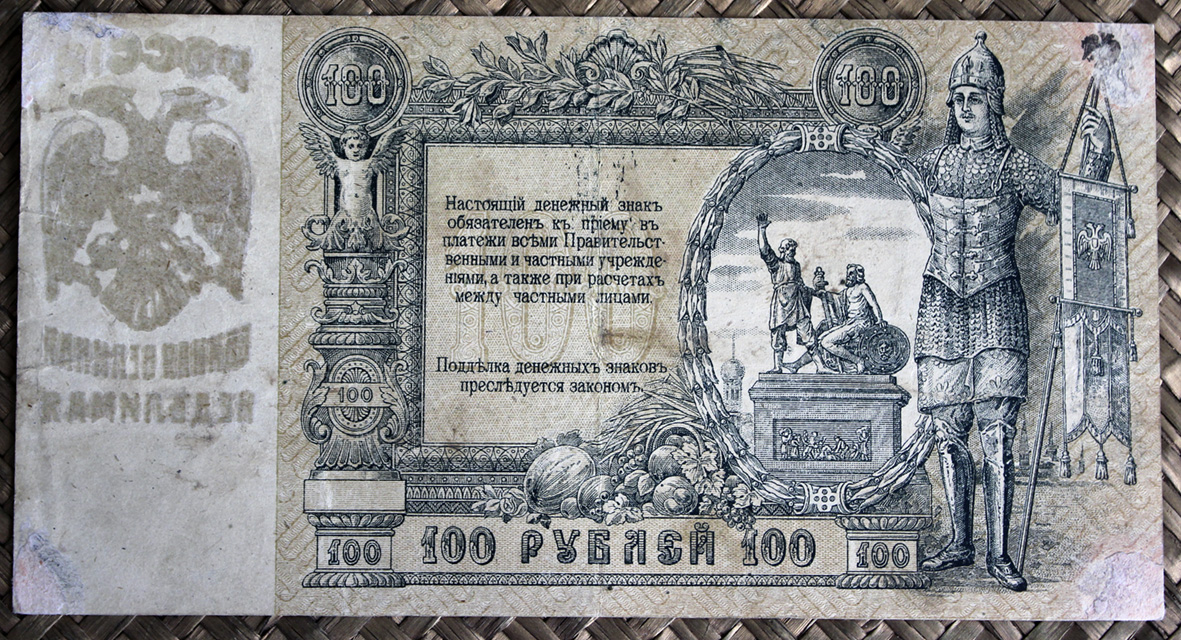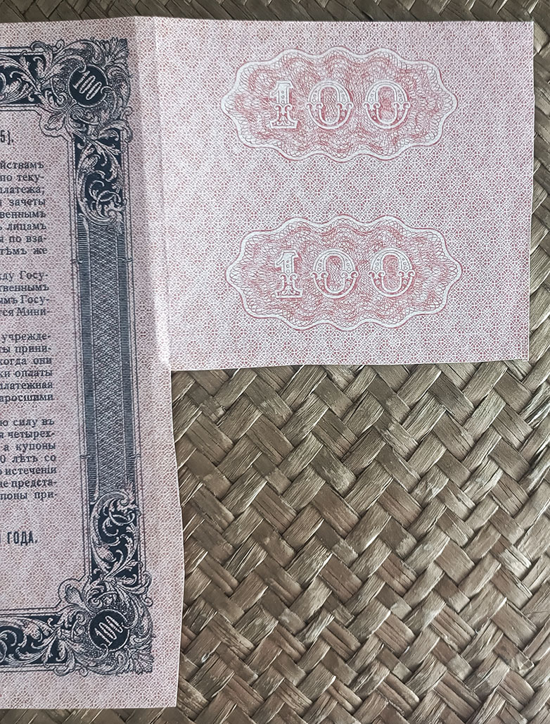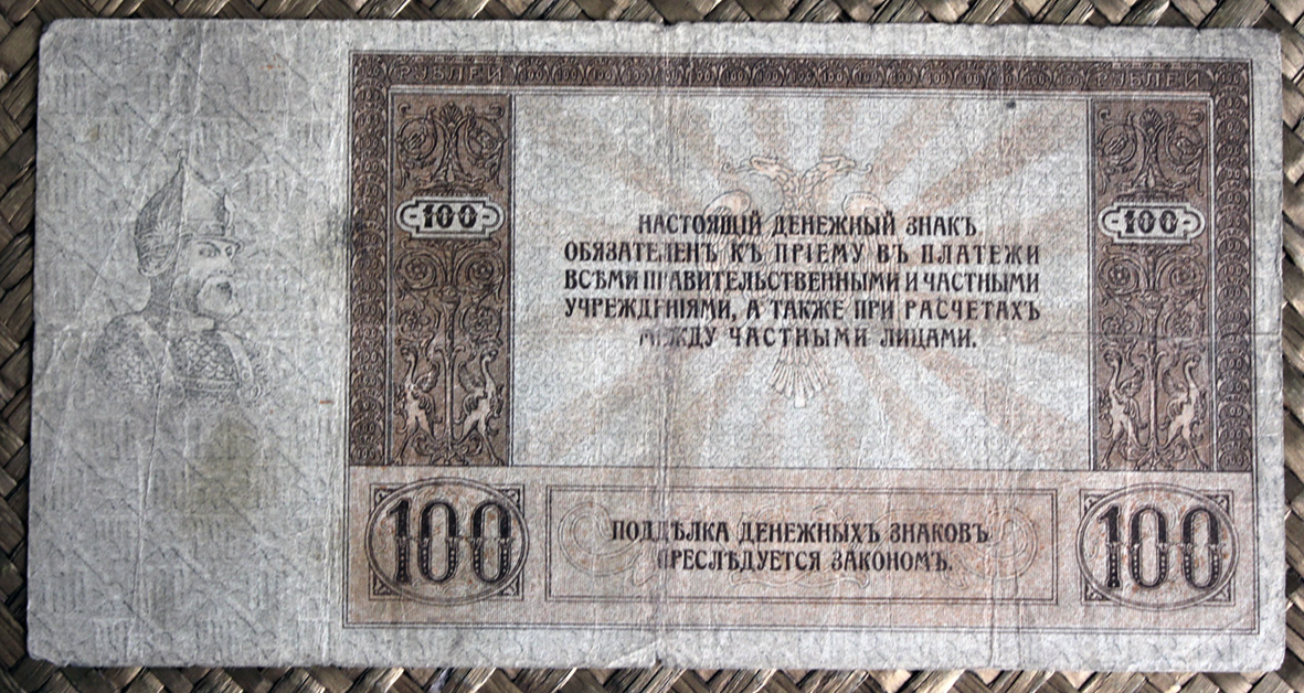 Los billetes o notas del Tesoro del Estado (BGK) se pusieron en circulación en enero de 1918 (Decreto del Comité Ejecutivo Central de Rusia del 21 de enero). Se habían emitido en los valores de 25 rublos (cartela de año 1915), 50 rublos (cartelas de años 1908, 1912, 1913, 1914 o 1915), 100 rublos (cartelas de años 1908, 1912, 1913, 1914 o 1915) y 500 rublos (cartelas de años 1915 o 1916). Las cartelas, que mostraban el año en ambas ramas laterales de la ornamentación floral, nos indicarían la fecha de inicio del devengo de intereses. En la cartela al pie del anverso quedaba indicada la fecha de redención o rescate por vencimiento del titulo nominal.