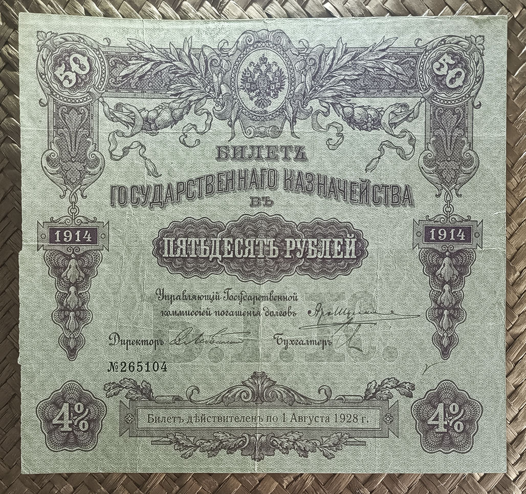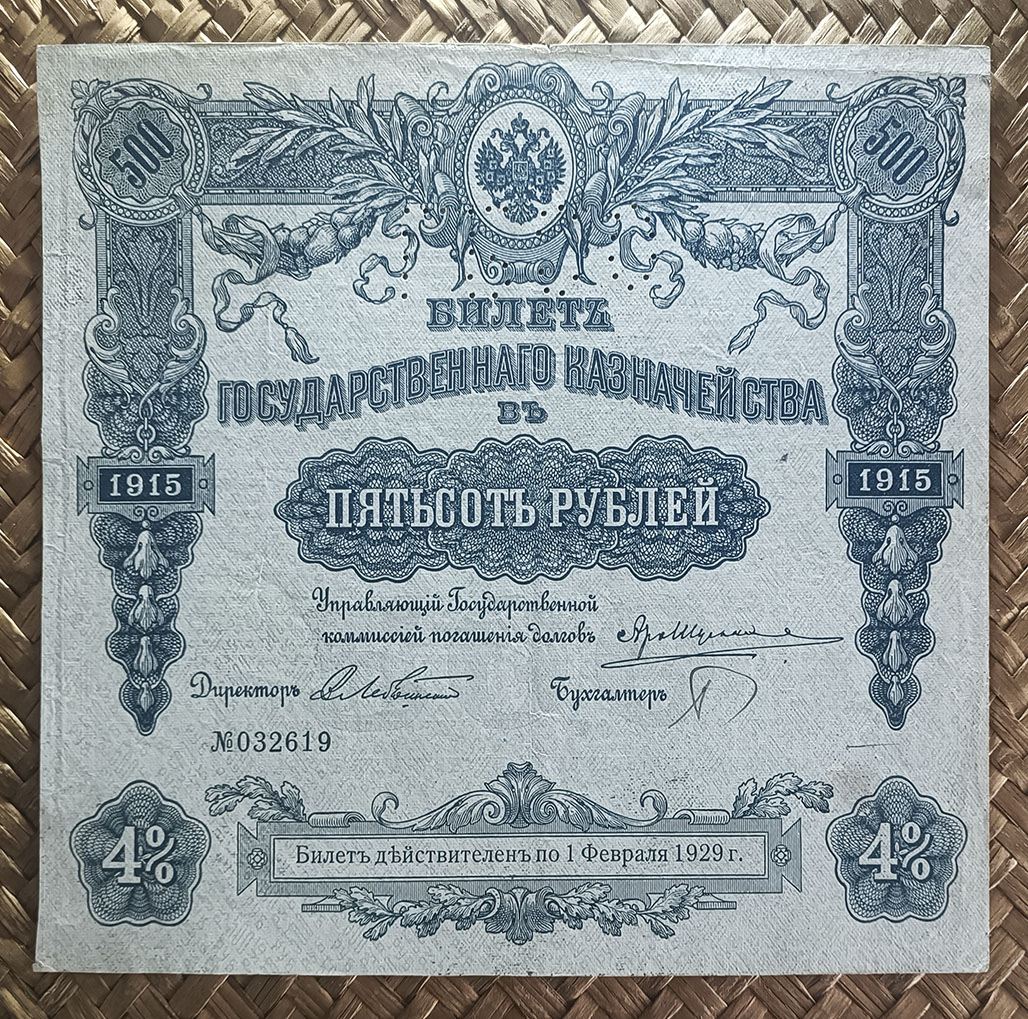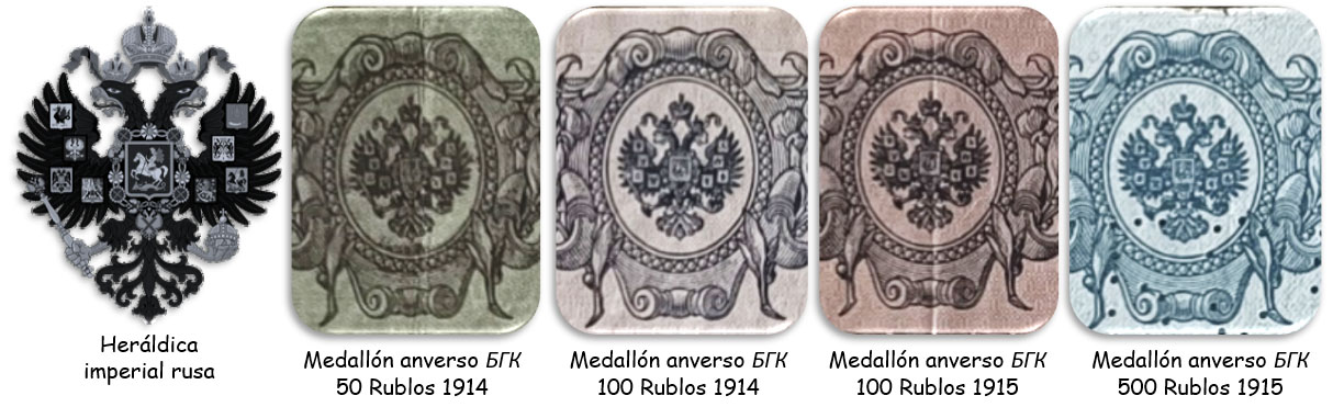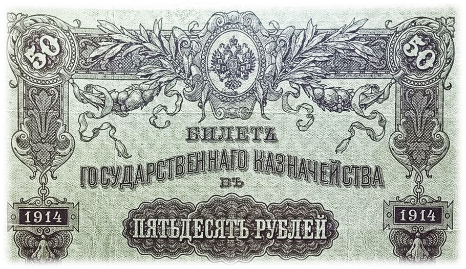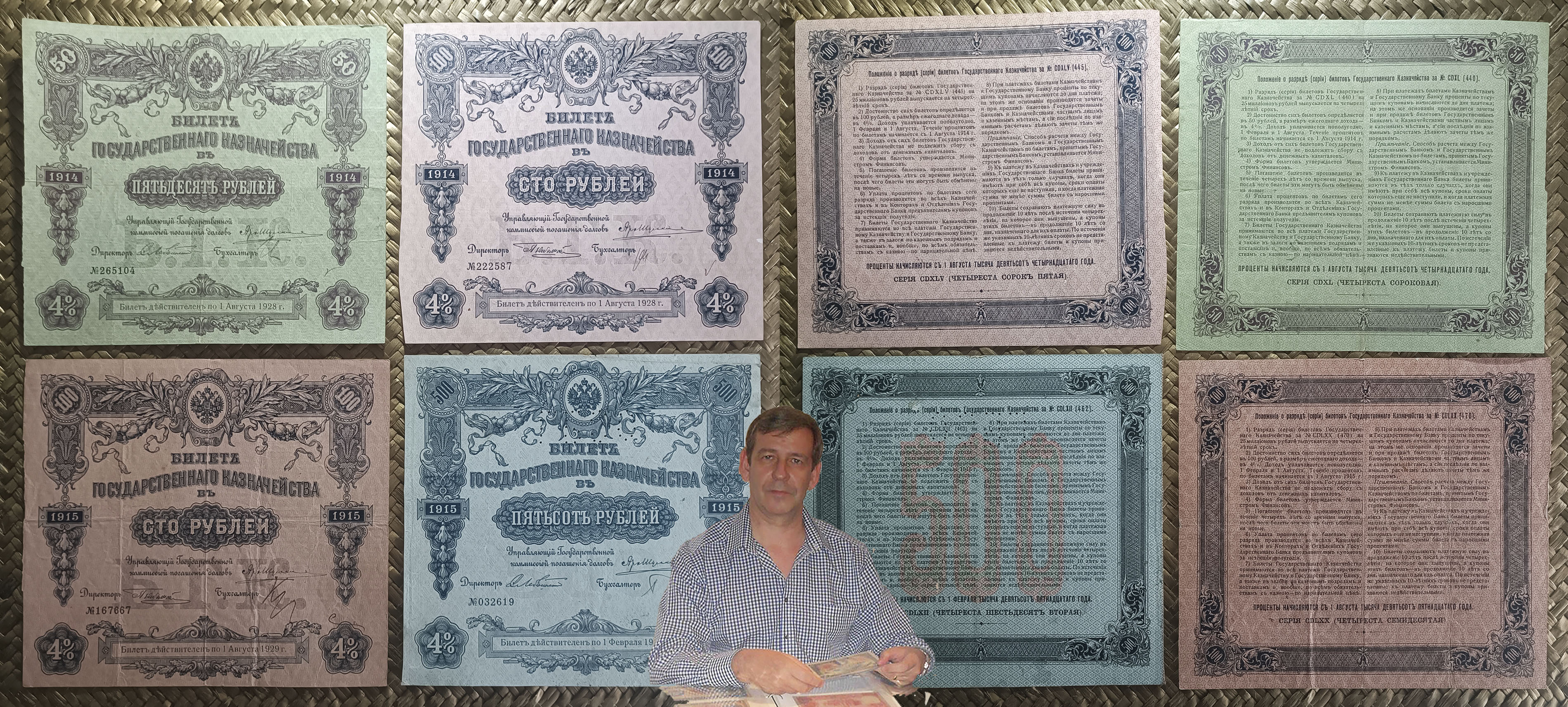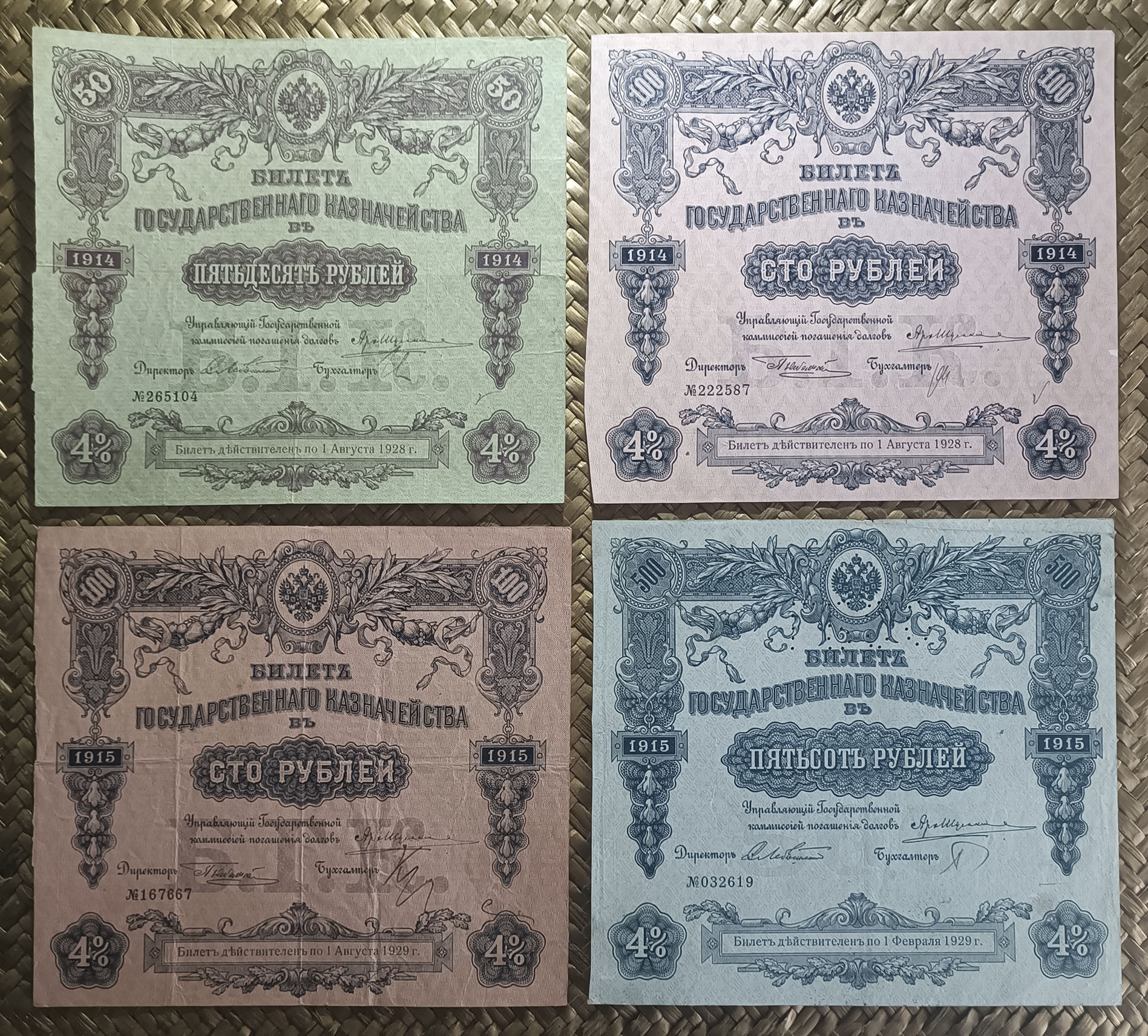 Revisaremos los Bonos del Tesoro Estatal de 50 rublos de 1914, de 100 rublos de 1914 y 1915 y de 500 rublos de 1915. En su diseño todos presentaban un artístico anverso con una cinta superior de ornamentación floral presidida por un medallón central con el escudo imperial ruso del águila bicéfala.