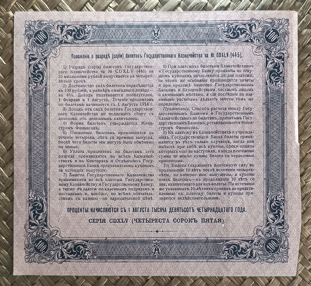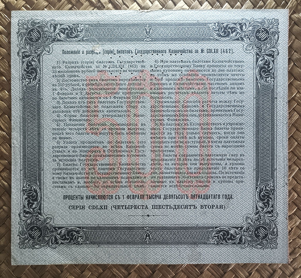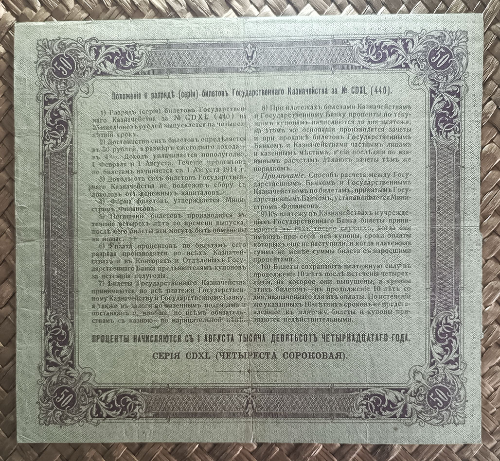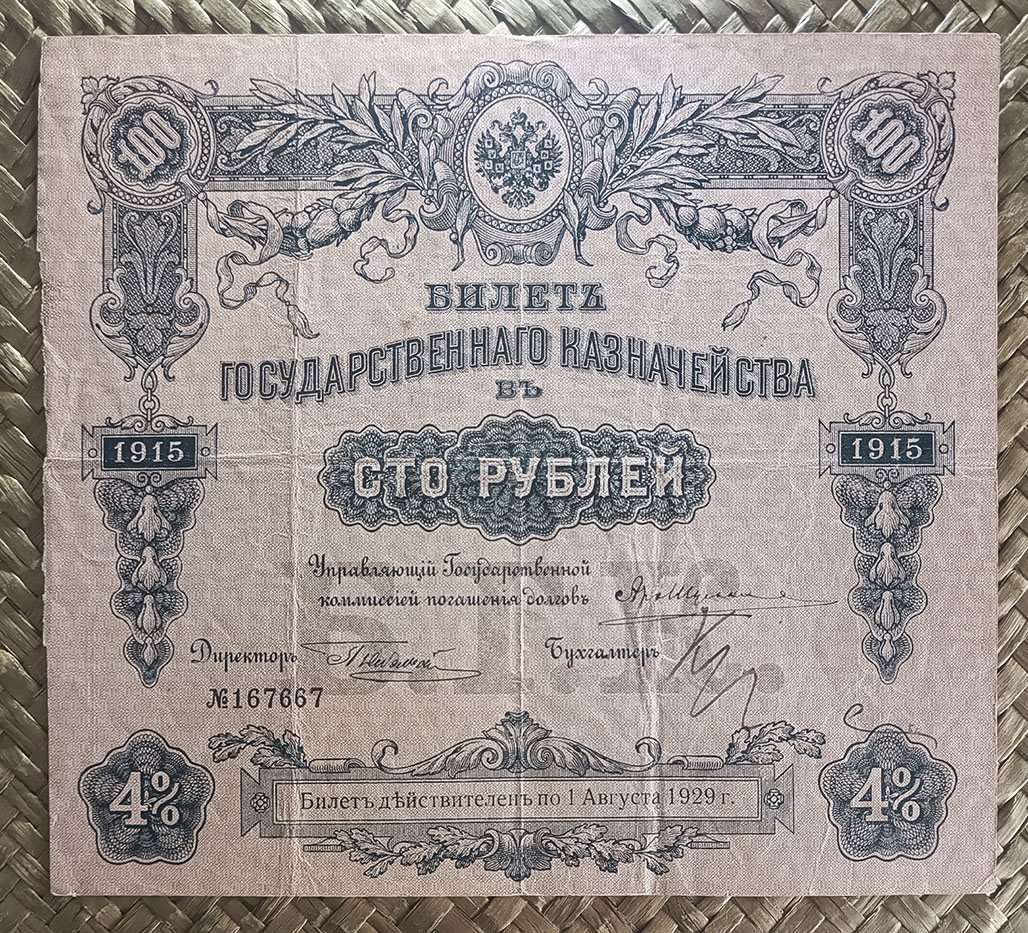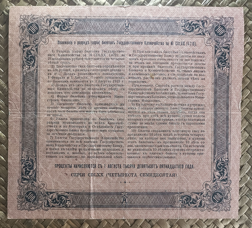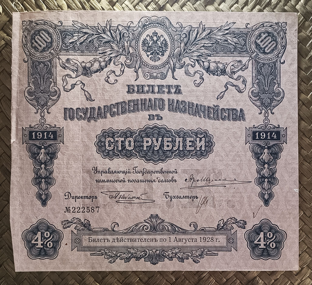 Revisaremos los Bonos del Tesoro Estatal de 50 rublos de 1914, de 100 rublos de 1914 y 1915 y de 500 rublos de 1915. En su diseño todos presentaban un artístico anverso con una cinta superior de ornamentación floral presidida por un medallón central con el escudo imperial ruso del águila bicéfala.