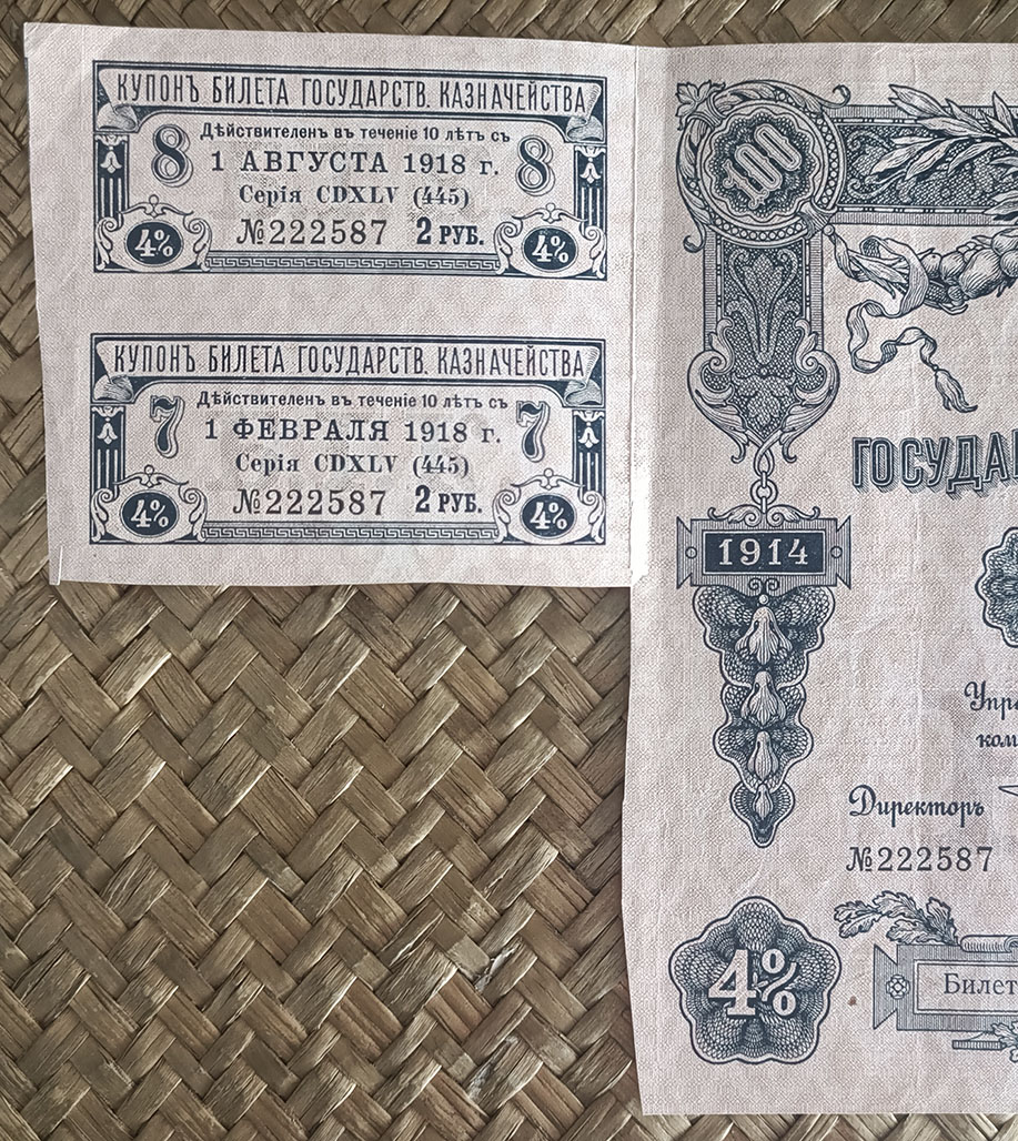 Estas notas llevaban en su matriz izquierda ocho cupones de vencimiento semestral y valor (el correspondiente a ese 4% de interés aplicado al nominal de la nota y al semestre de amortización). En el ejemplo anterior se pueden leer los únicos dos cupones aún no amortizados, de 2 rublos (4% de 100 rublos en seis meses), correspondientes a febrero 1918 (cupón nº7) y agosto 1918 (cupón nº8) del ejemplar de 100 rublos de 1914 revisado.