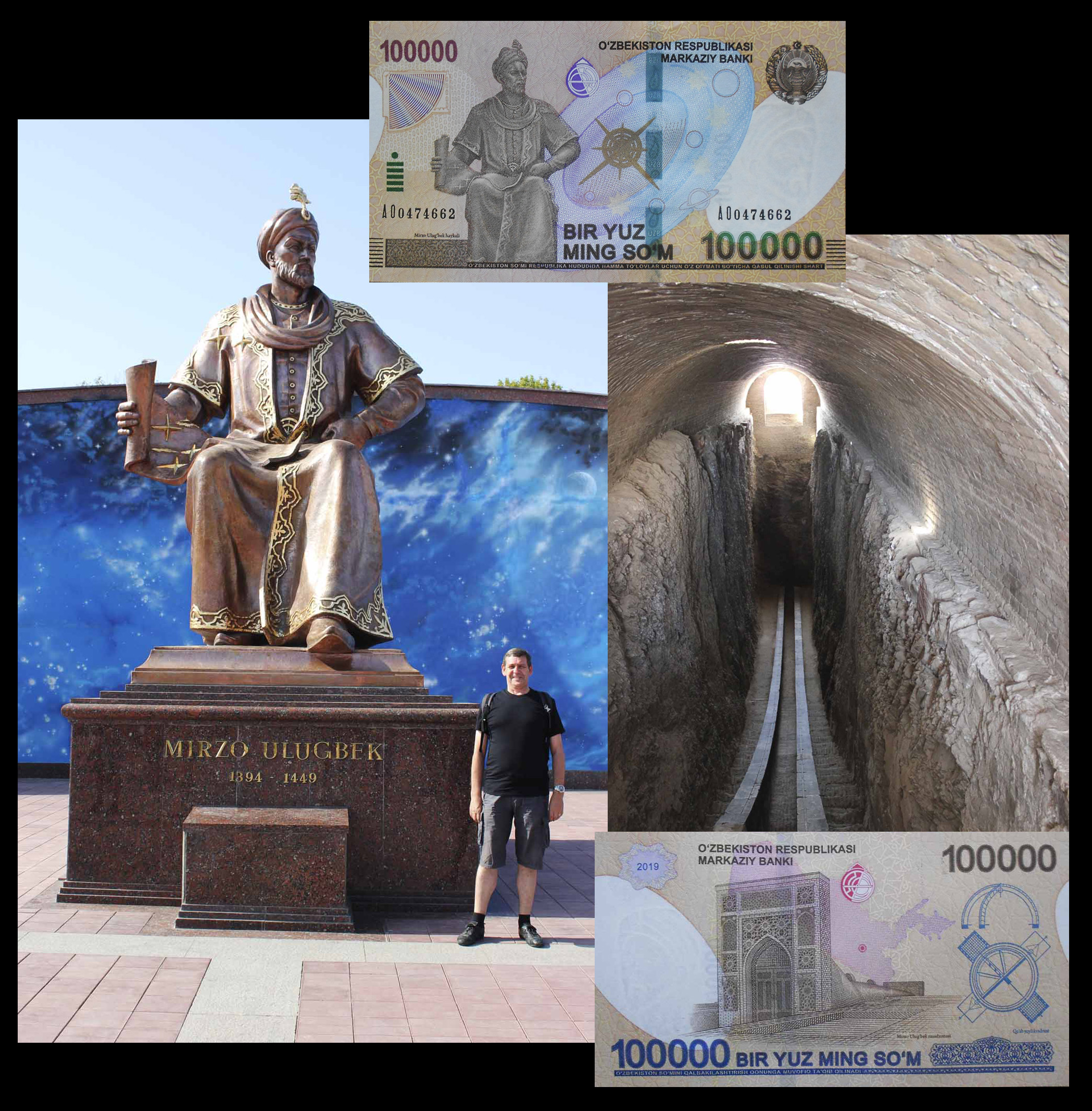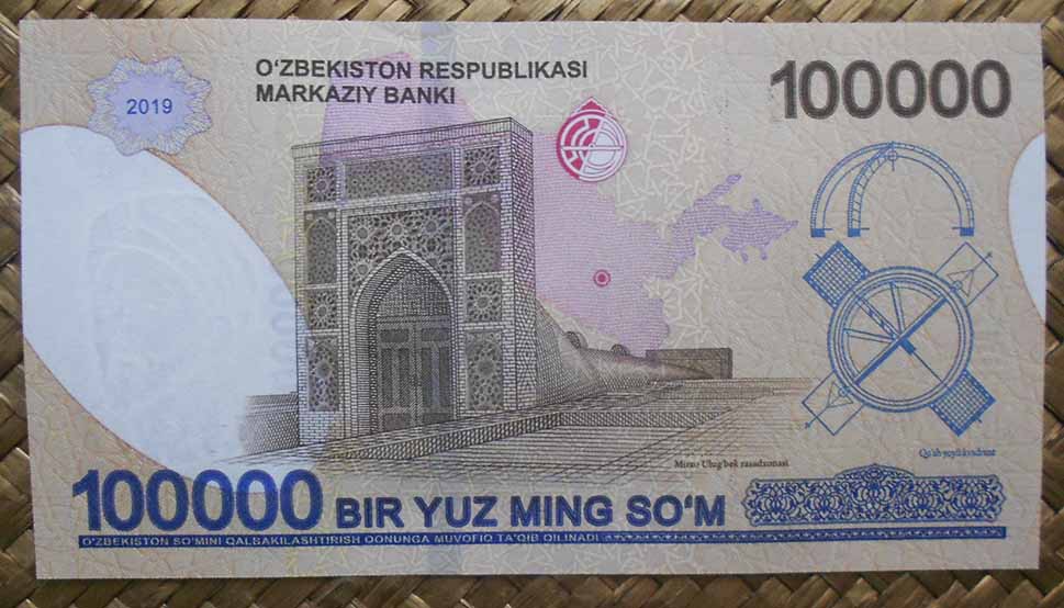En el reverso del billete de 100.000 sum de 2019 nos ofrecen la entrada a lo que queda del Observatorio, por la que accederemos al sextante Fakhri; veremos tras el grabado el mapa de Uzbekistán (cuyo interior se rellena con el microtexto repetitivo “OZBEKISTON REPUBLIKASI”). También se representa el plano del cuadrante en vista de planta y su cúpula en perspectiva alzada.