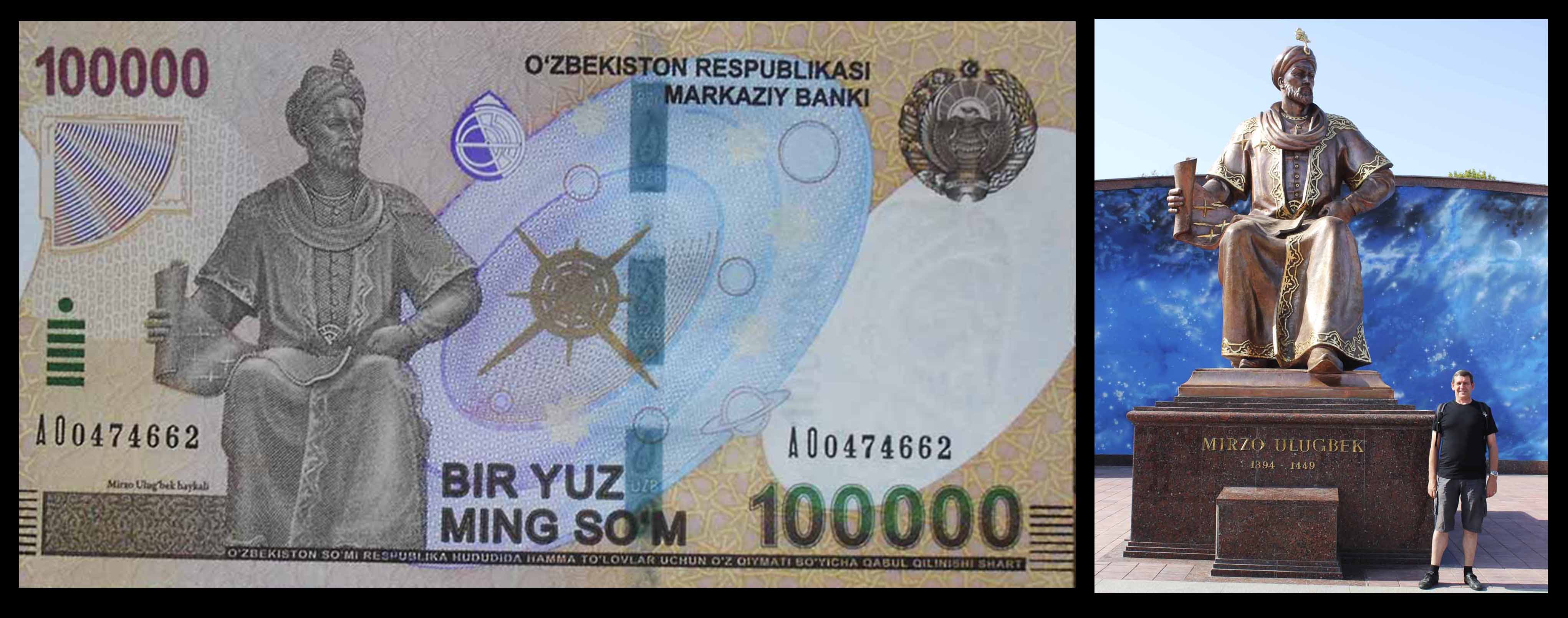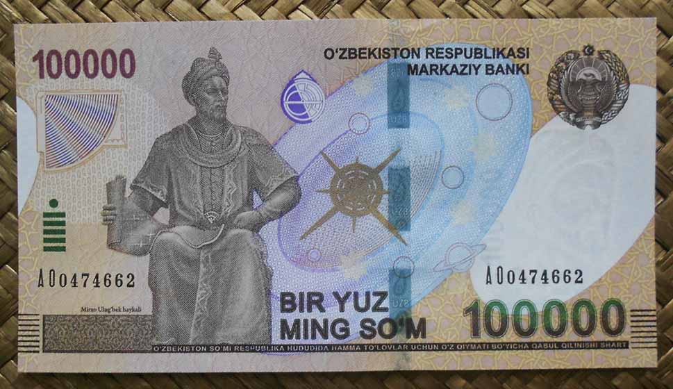 Ulugh Beg aparecerá viñeteado en el billete de 100.000 sum de Uzbekistán de 2019. Su anverso nos ofrece su monumento erigido a las puertas del Observatorio homónimo acompañado de una imagen latente (en 3D) del sistema solar. También veremos representaciones figuradas de un cuadrante y un astrolabio, así como el escudo de armas uzbeko.