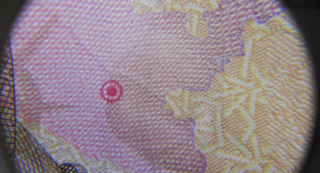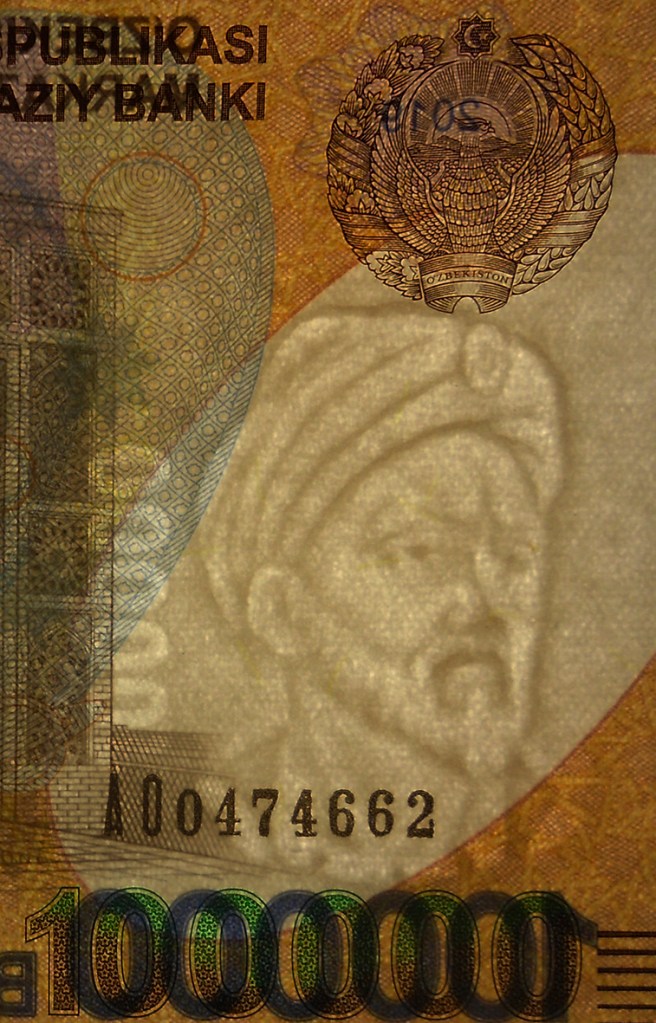 Su marca de agua nos representa la cabeza de Ulugh Beg y el valor del billete filigranado en vertical.