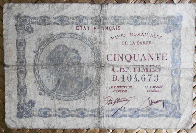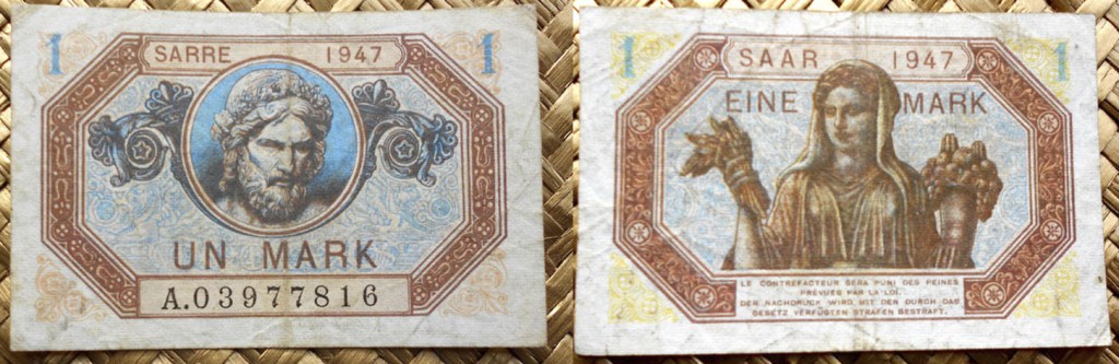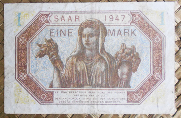 El Saar-Mark es uno de los billetes más efímeros que conozco, ya que solo tuvo vigor como medio de pago entre junio y noviembre de 1947 en Alemania, y hasta enero de 1948 para pagos e intercambios en la región del Sarre. A partir de entonces, fue reemplazado por el franco francés. El tipo de cambio establecido fie de 1 Saar-Mark = 20 Francos.