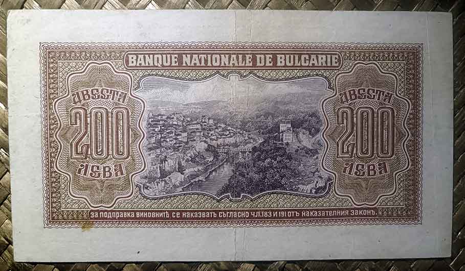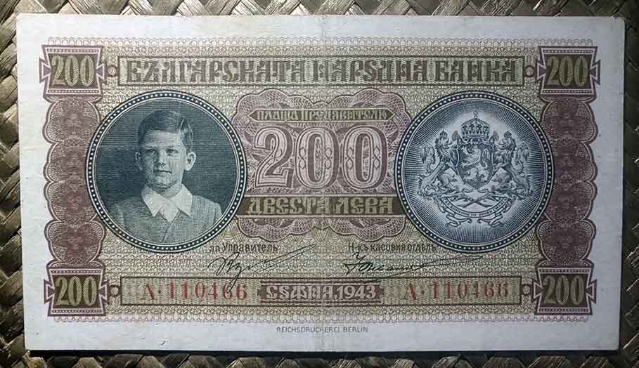 El billete de 200 levas de Bulgaria de 1943, en cromaticidad predominante amarronada, nos presenta en su anverso a Simeón II y el escudo en sendos marcos circulares.