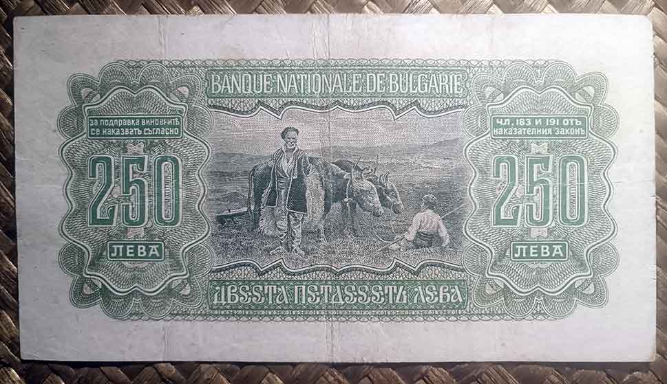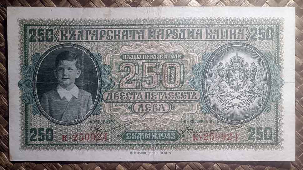El billete de 250 levas de Bulgaria de 1943, en cromaticidad predominante verde, nos ofrece en su anverso a Simeón II y el escudo en sendos marcos ovalados.