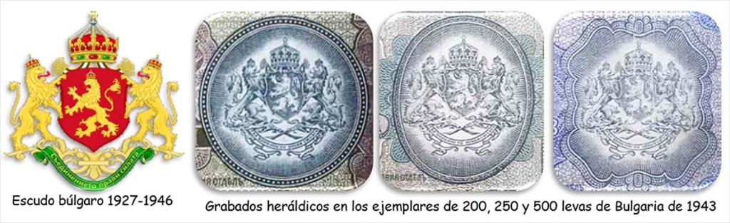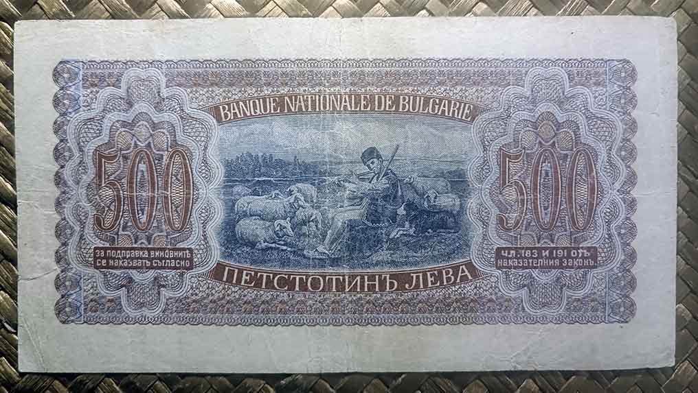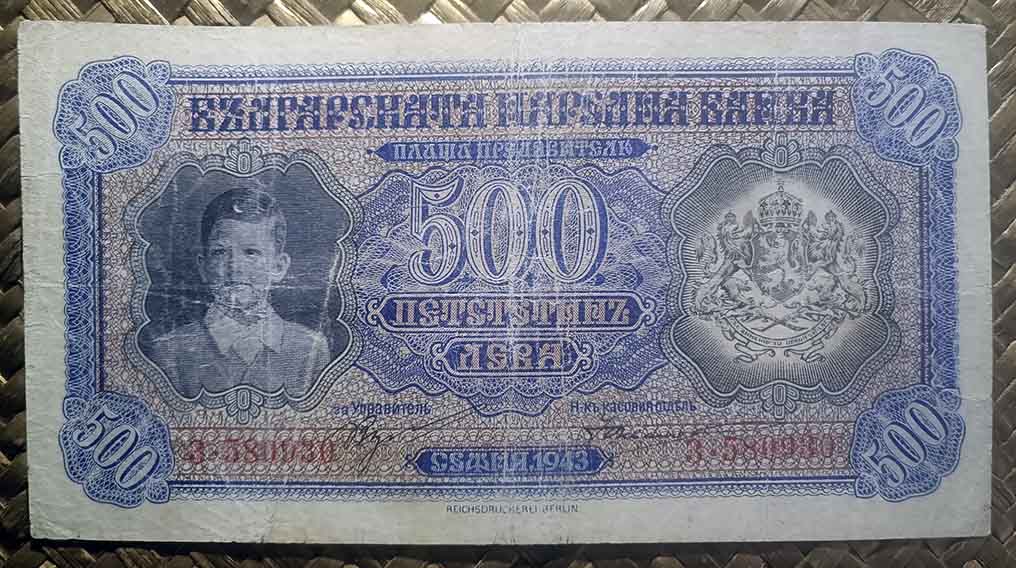 El billete de 500 levas de Bulgaria de 1943, en cromaticidad predominante azul, nos muestra en su anverso a Simeón II y el escudo en sendos marcos octogonales.