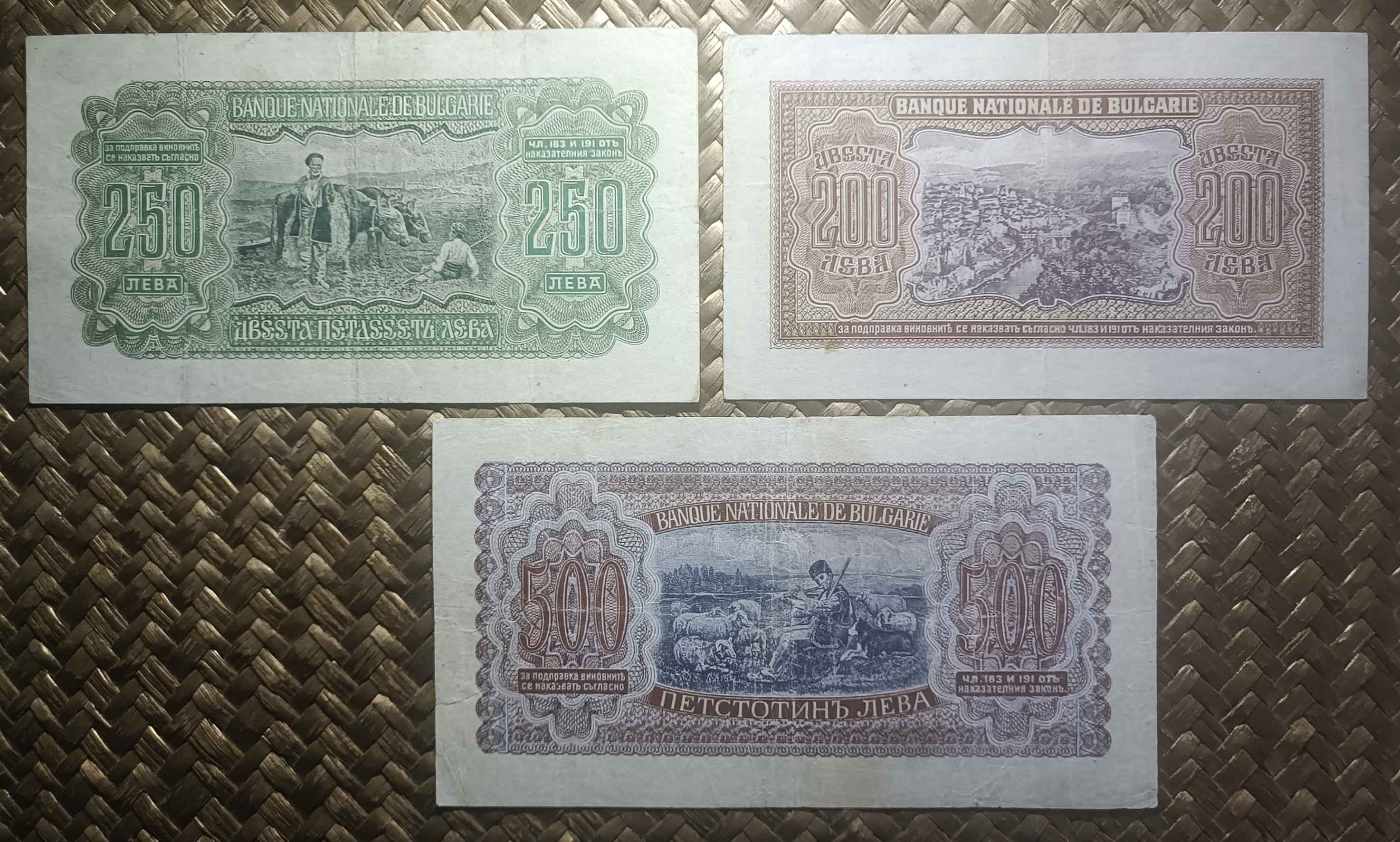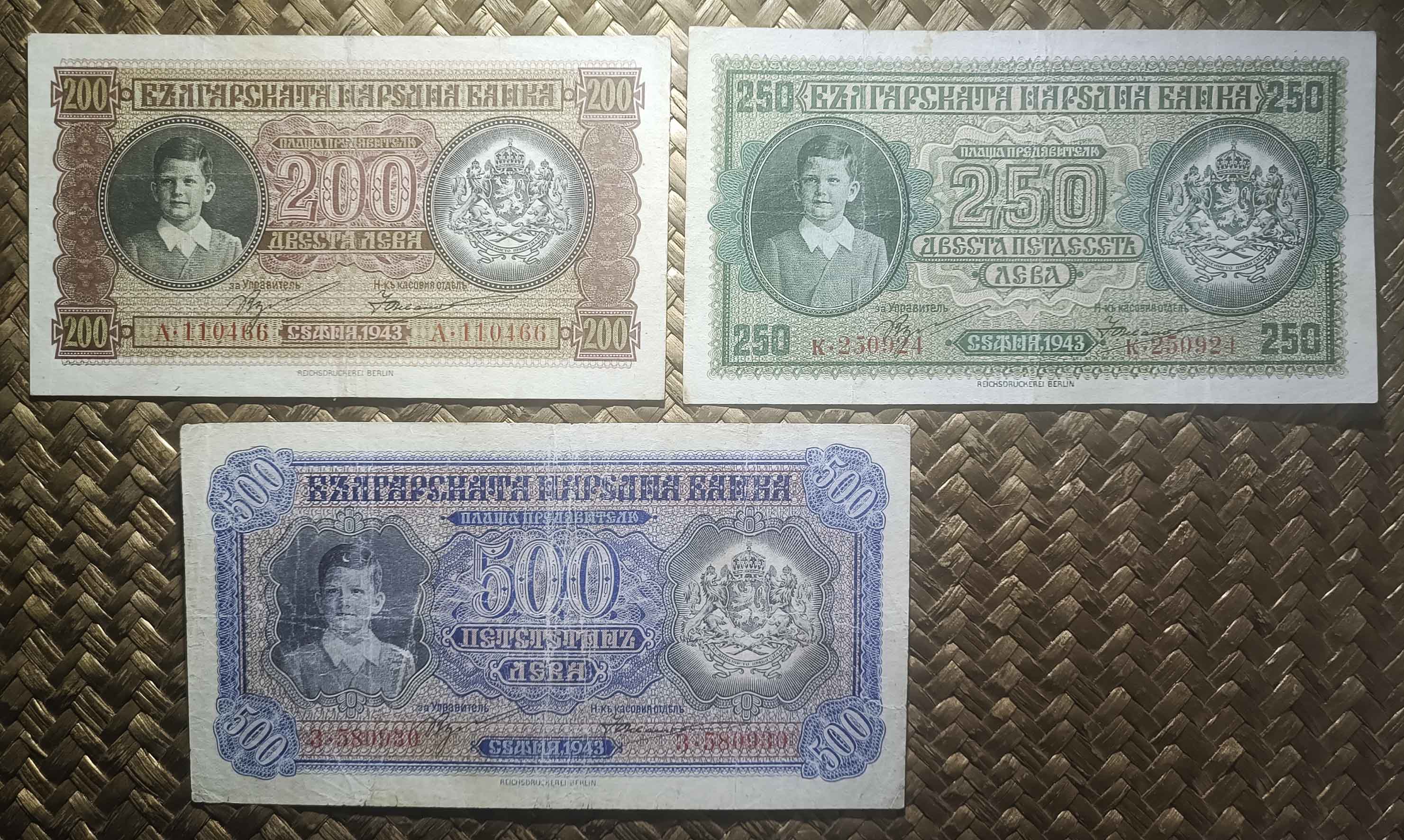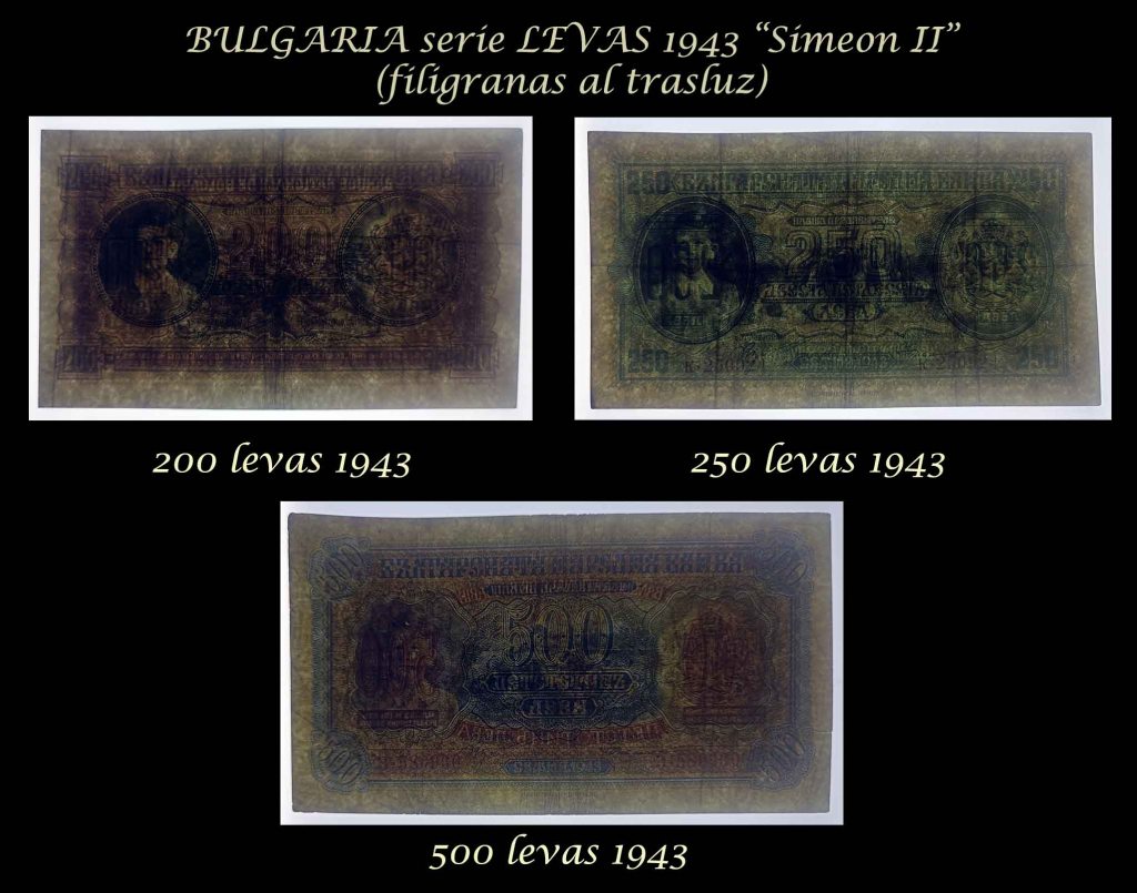 Sus anversos nos ofrecen el retrato del zar Simeón niño, recién proclamado rey a la edad de seis años. Fueron impresos por la Reichsdruckerei (o imprenta del Reich) de Berlín. Textos en búlgaro y números de serie por duplicado en tipografía roja. Llevan las firmas de Kiril Gunev y Asen Ivanov como Gobernadores del Banco.