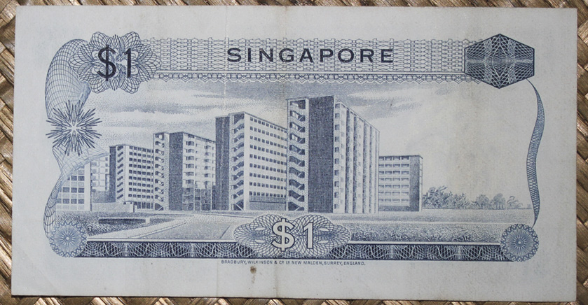 El ejemplar de 1 dólar de Singapur de 1967 nos presenta al anverso una orquídea del género “Vanda Janet Kaneali”, de flores rosas. Su reverso nos muestra la vista aérea de una urbanización de edificios residenciales urbanos. Su cromaticidad predominante en ambos lados es azul zafiro. Lleva la firma de Lim Kim San como Minister for Finance.