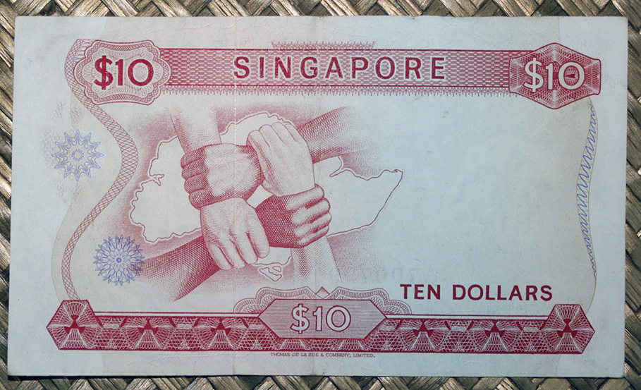 El ejemplar de 10 dólares de Singapur de 1967 nos ofrece al anverso la orquídea de género “Dendrobium Marjorie Ho -Tony Pek“ de flores rojo rosáceas. Para el reverso nos ofrecen el grabado de cuatro antebrazos (con cierto coloreado multirracial) con las manos entrelazadas formando una silla sobre el mapa de Singapur. Su cromaticidad predominante en ambos lados es el rojo púrpura. Lleva la firma de Lim Kim San como Minister for Finance.