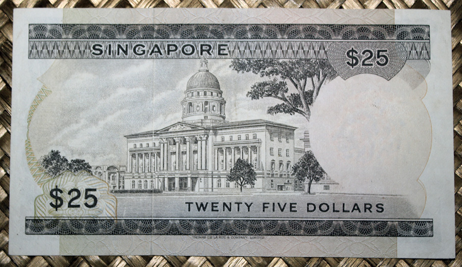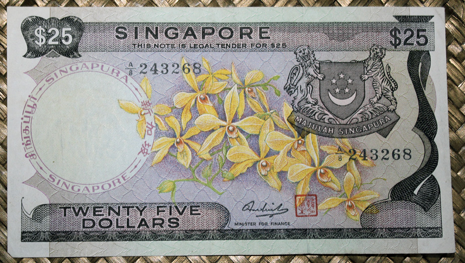 El billete de 25 dólares de Singapur de 1972 nos muestra al anverso una orquídea del género “Renanthopsis Aurora” de flores amarillas. Es el único de los mostrados en el que aparece en este lado, junto a la firma de validación, un pequeño sello real de símbolos, de formato cuadrado y tinta roja. En el reverso vemos el antiguo edificio del Tribunal Supremo de Singapur (su construcción, de corte clásica, data de 1937), hoy sede del museo Galería Nacional. Su cromaticidad predominante es el marrón grisáceo. Lleva la firma de Hon Sui Se Sen como Minister for Finance.