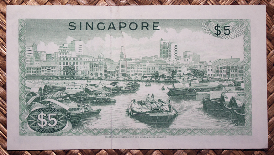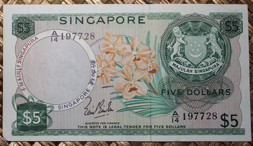 El billete de 5 dólares de Singapur de 1967 nos muestra al anverso una orquídea del género “Papilionanda T.M.A.” de flores amarillo rosáceas. En su reverso vemos una escena del río Singapur con pequeños barcos de comercio y su distrito de negocios en la orilla. Su cromaticidad predominante en ambos lados es el verde oliva. Lleva la firma de Lim Kim San como Minister for Finance.