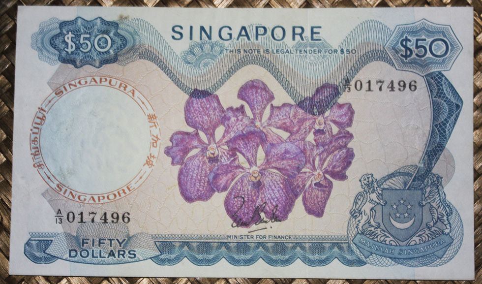 El ejemplar de 50 dólares de Singapur de 1967 nos ofrece al anverso la orquídea de género “Vanda Rothscildiana -Teo Choo Hong» de flores violetas. En su reverso contemplamos el Downtown Core de Singapur con una vista cercana del muelle de Clifford (levantado en 1933, funcionó hasta 2006) en la bahía de Marina Bay, ahora convertido en restaurante. Cromaticidad predominante azul turquesa. Lleva la firma de Lim Kim San como Minister for Finance.