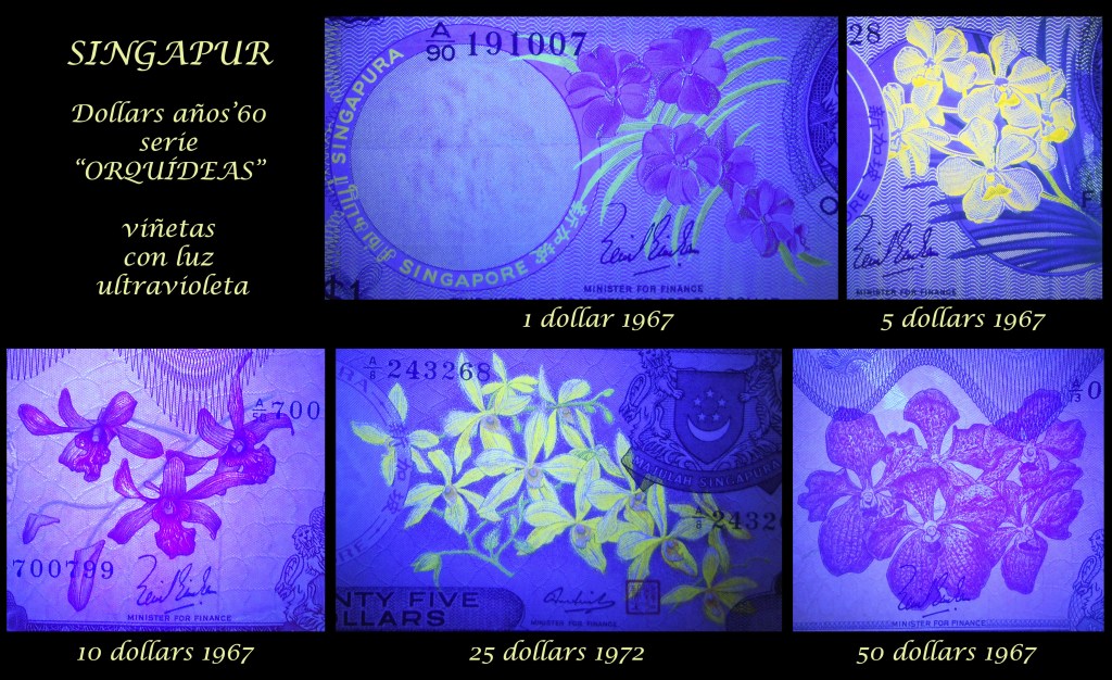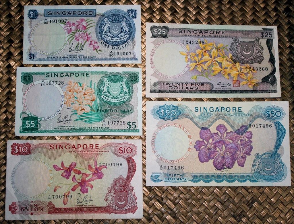 Revisaremos los ejemplares de Singapur de 1 dólar de 1967, 5 dólares de 1967, 10 dólares de 1967, 25 dólares de 1972 y 50 dólares de 1967. Todos pertenecen a la serie denominada “Orquídeas” por las viñetas principales de sus anversos, que representan distintas especies de esta flor que podremos encontrar en su territorio. Acompaña estos anversos el escudo de armas de Singapur en la esquina inferior derecha de los mismos.