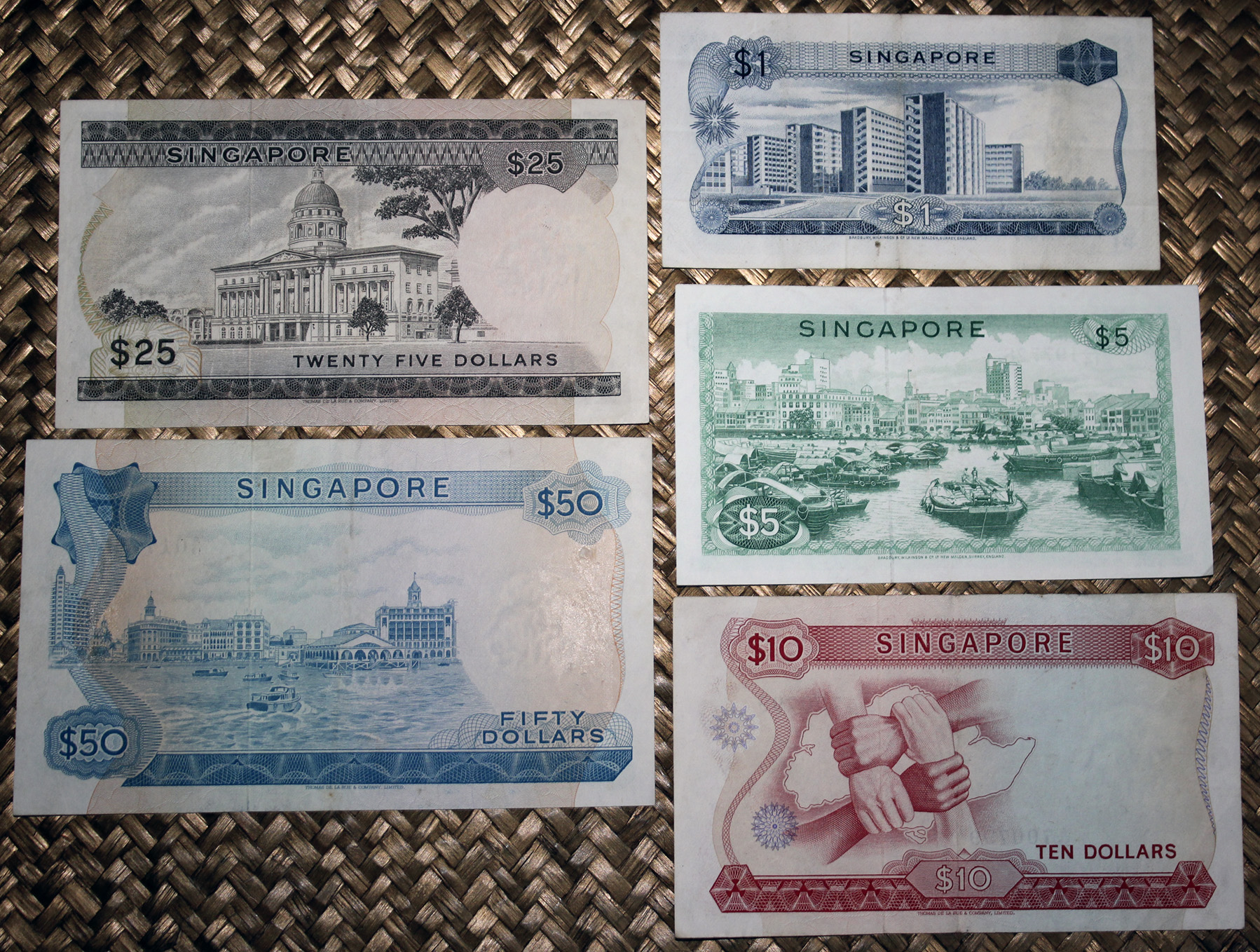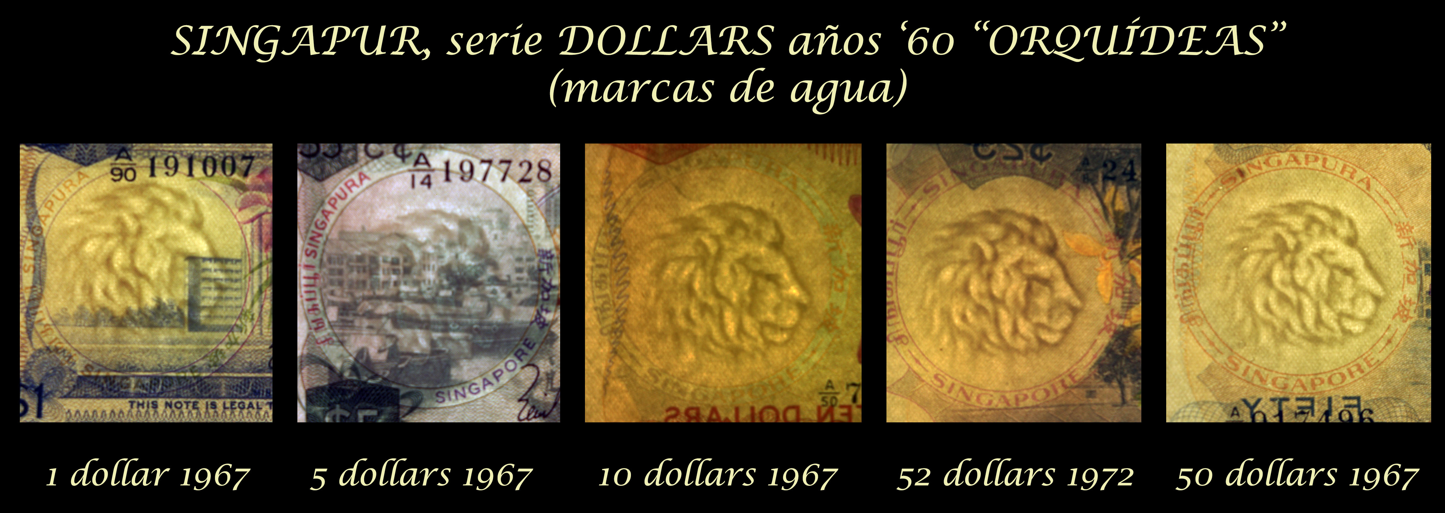 Revisaremos los ejemplares de Singapur de 1 dólar de 1967, 5 dólares de 1967, 10 dólares de 1967, 25 dólares de 1972 y 50 dólares de 1967. Todos pertenecen a la serie denominada “Orquídeas” por las viñetas principales de sus anversos, que representan distintas especies de esta flor que podremos encontrar en su territorio. Acompaña estos anversos el escudo de armas de Singapur en la esquina inferior derecha de los mismos.