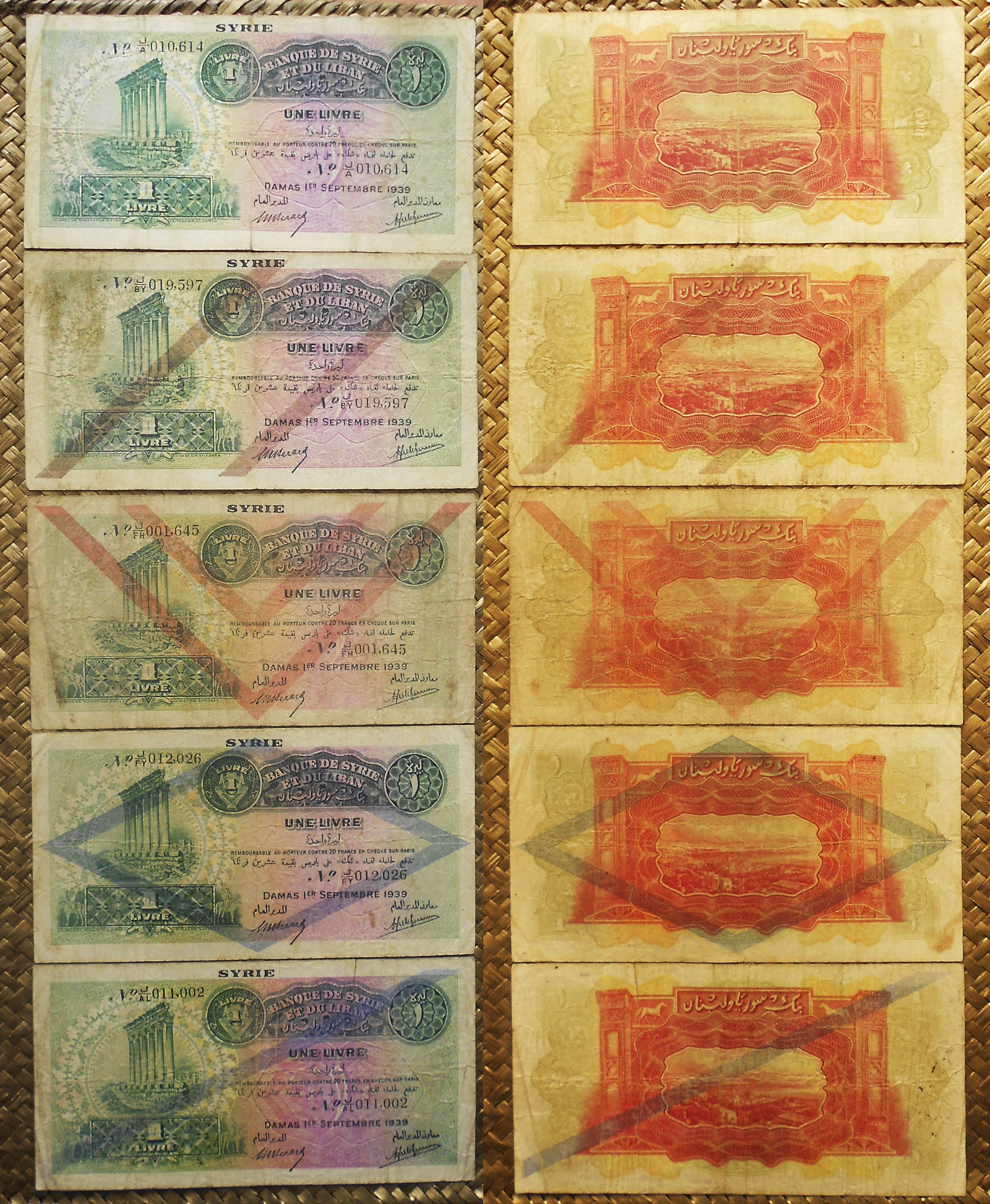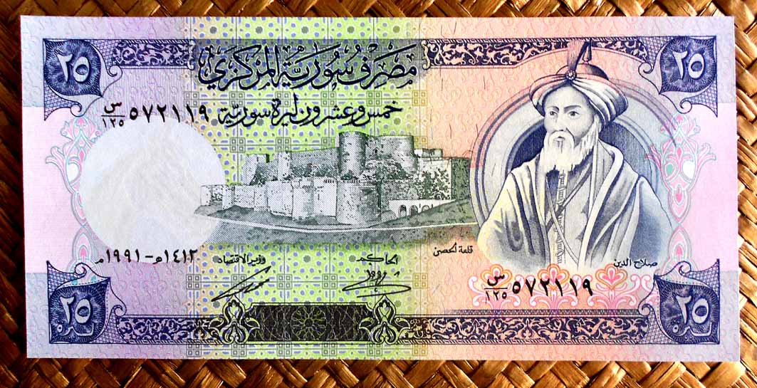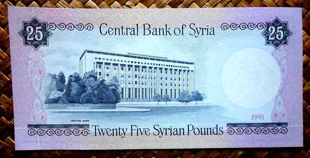 Vamos a revisar los ejemplares emitidos en las décadas ’60 y ’70 del pasado siglo, bajo el gobierno del Presidente Hafez Al Assad. Veremos los billetes del Banco Central de Siria de 1 libra de 1982, 5 libras de 1973, 10 libras de 1968, 25 libras de 1973, 50 libras de 1973 y 100 libras de 1971. Una serie en la que se interacciona con el desarrollo del país a través de sus gentes, mostrando escenas con trabajadores de diferentes gremios (en anversos) y la cultura histórica del territorio a través de su arquitectura en diferentes épocas, romana, omeya, bizantina, mameluca, otomana y moderna (en reversos).