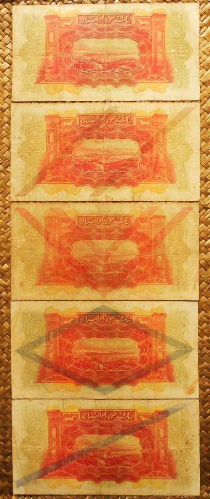 Sus anversos nos acercan a labores populares con figuraciones de obreros en sus puestos de trabajo, operarios industriales, tejedores, agricultores y entorno portuario. Todos los datos identificativos, entidad emisora, valor, divisa, validadores, firmas, fecha y números de serie en grafía árabe. Fueron impresos por la empresa Pakistan Security Printing Corporation.