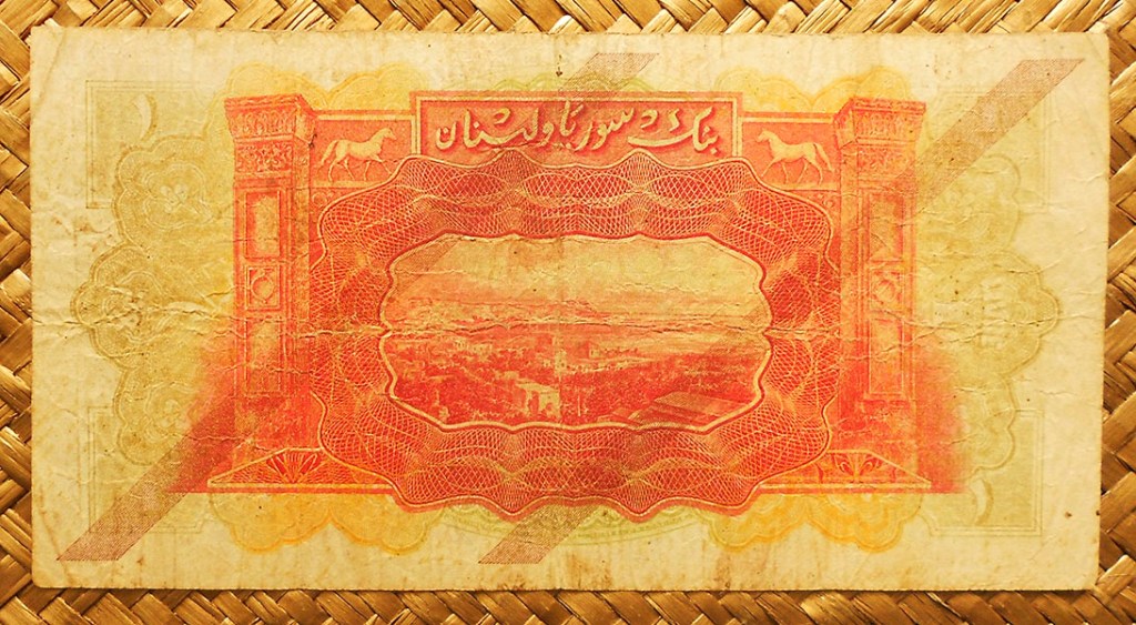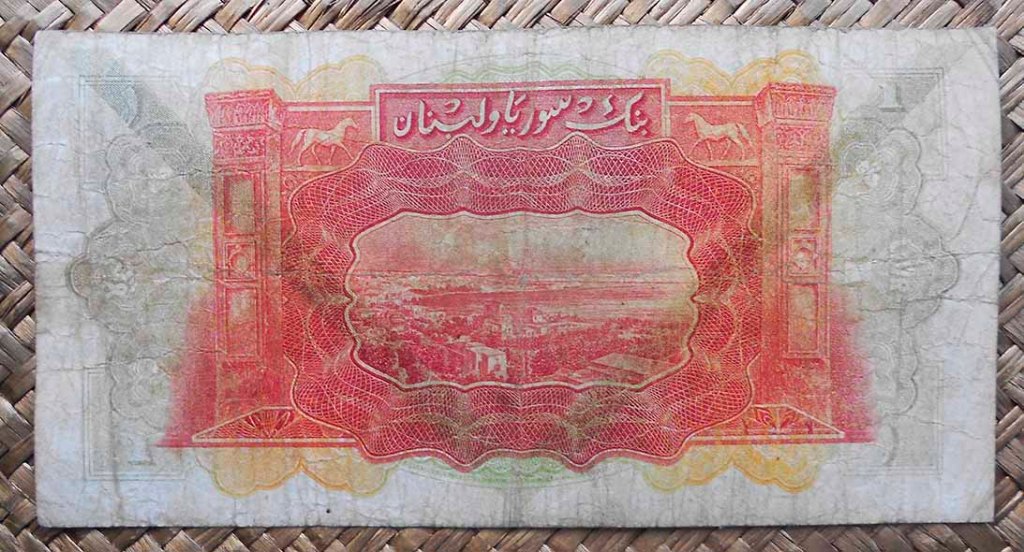 Los textos identitarios de entidad bancaria, valor, divisa y año de emisión aparecen en inglés, siendo la primera vez que se usa este idioma en el billetario sirio (a partir de 1958 se suprimió el uso del francés, que había identificado el billetario sirio desde los inicios del protectorado galo en 1920).