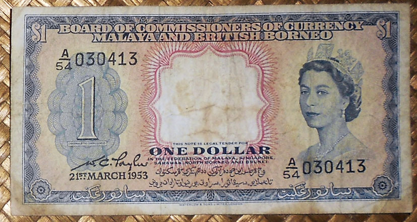 El billete de 1 dólar de  Malaya & British Borneo de 1953 nos muestra en su anverso el retrato de la reina Isabel II, extraido de la foto que le realizó Dorothy Wilding en 1952. Se muestra portando la Diadema de Estado del rey Jorge IV (creada para la coronación real en 1820) y el collar de Cartier que le regaló para su boda en 1947 el último Nizam de Hyderabad y Berar, Osman Ali Khan. Impreso por la empresa londinense Waterlow & Sons Ltd. en cromaticidad azul rosácea, lleva la firma de W. C. Taylor como Director del Consejo Monetario. Textos en inglés, malayo y jawi (árabe del sureste asiático).