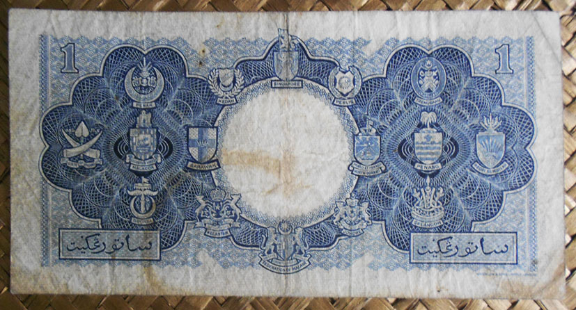 En orden cronológico comenzamos con los Straits Settlements o Asentamientos del Estrecho, de los que revisamos el billete de 1 dólar de 1921 y el ejemplar de 1 dólar de 1935. Estos territorios fueron una cesión de la Compañía Británica de las Indias Orientales en 1867 para su administración por el gobierno británico. Abarcaban los asentamientos de Malaca, Penang, Dinding y Singapur, pequeñas porciones territoriales de la península de Malaca (actual Malasia) inconexas entre ellas y rodeadas del resto de estados que pronto formarían la Unión Malaya. Con capital en Singapur, los Straits Settlements fueron disueltos en 1946, tras la ocupación japonesa y la creación de la Unión Malaya, que iba a incluir tanto sus territorios como el resto de estados de la península malaya.