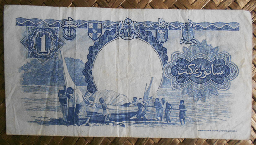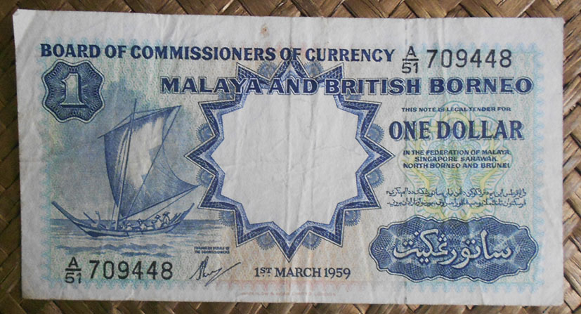 El billete de 1 dólar de  Malaya & British Borneo de 1959. En su anverso una estrella central en blanco hace de ventana para la marca de agua. A su izquierda un barco de pesca con la vela extendida. A su derecha textos de referencia a su valor y uso en los idiomas inglés, malayo y jawi. Número de serie con letra fraccional en tipografía negra, por duplicado y en posición diagonal. Impreso por la empresa londinense Waterlow & Sons Ltd. Cromaticidad predominante azulada con trazos amarillos y verdes. Lleva la firma de Tun Lee Hau Shik como representante del Comisionado “Forand on Behalf of the Commissioners”.