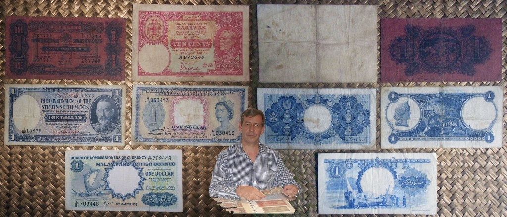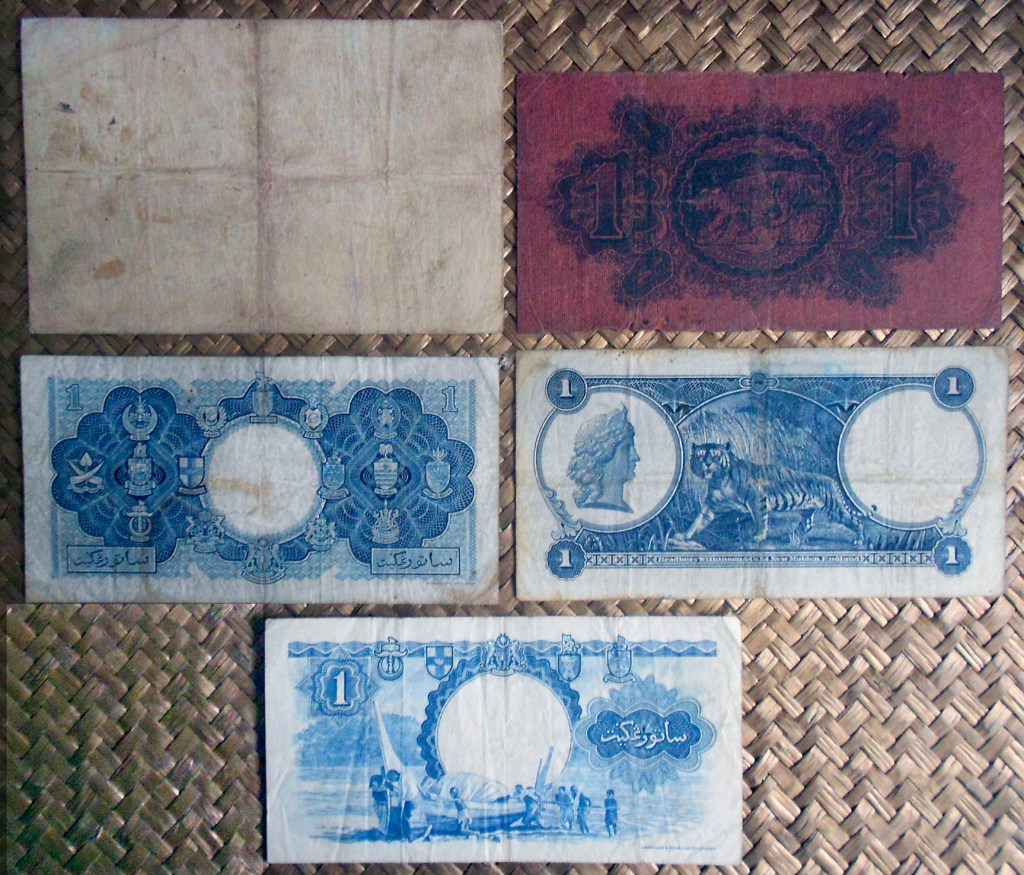 Contemplamos los ejemplares de 1 dólar de los Straits Settlements de 1921 y de 1935, el billete de 10 centavos de Sarawak de 1940 y los ejemplares de 1 dólar de Malaya & British Borneo de 1953 y de 1959. En sus grabados aparecerán desde los monarcas británicos Jorge V e Isabel II o el rajah Charles Brooke, hasta composiciones con dibujos heráldicos, escenas marítimas o el mismísimo tigre de Malasia. Fueron ediciones de diferentes imprentas, tanto europeas (Thomas de la Rue, Waterlow & Sons Ltd. o Bradbury, Wilkinson & Co. , las tres londinenses) como malayas ( Survey Dept. Fed. Malay States de Kuala Lumpur).