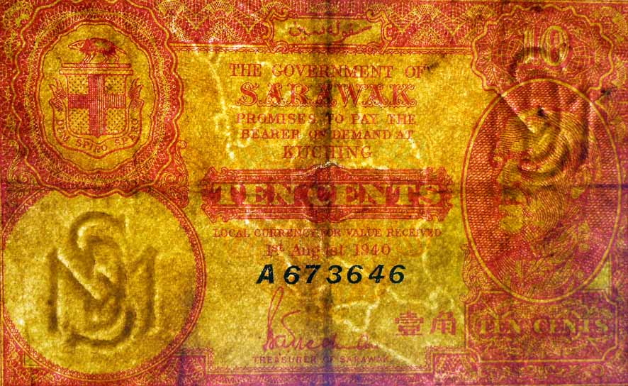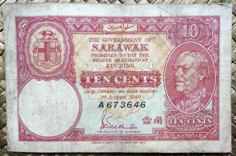El billete que contemplamos es la emisión de emergencia de 10 centavos de dólar de 1940, antes de la invasión japonesa de su territorio. Los 10 centavos de Sarawak de 1940 fueron impresos en Kuala Lumpur por la Survey Department Federal of Malaysia States. Es un billete uniface en coloración predominante roja y tonalidades verdes, azules y naranjas sobre papel blanco. Se emitieron tres series: A, B y C con numeraciones en tinta negra para uso en Kuching, la capital. Se le considera dinero de emergencia por su pequeño valor.