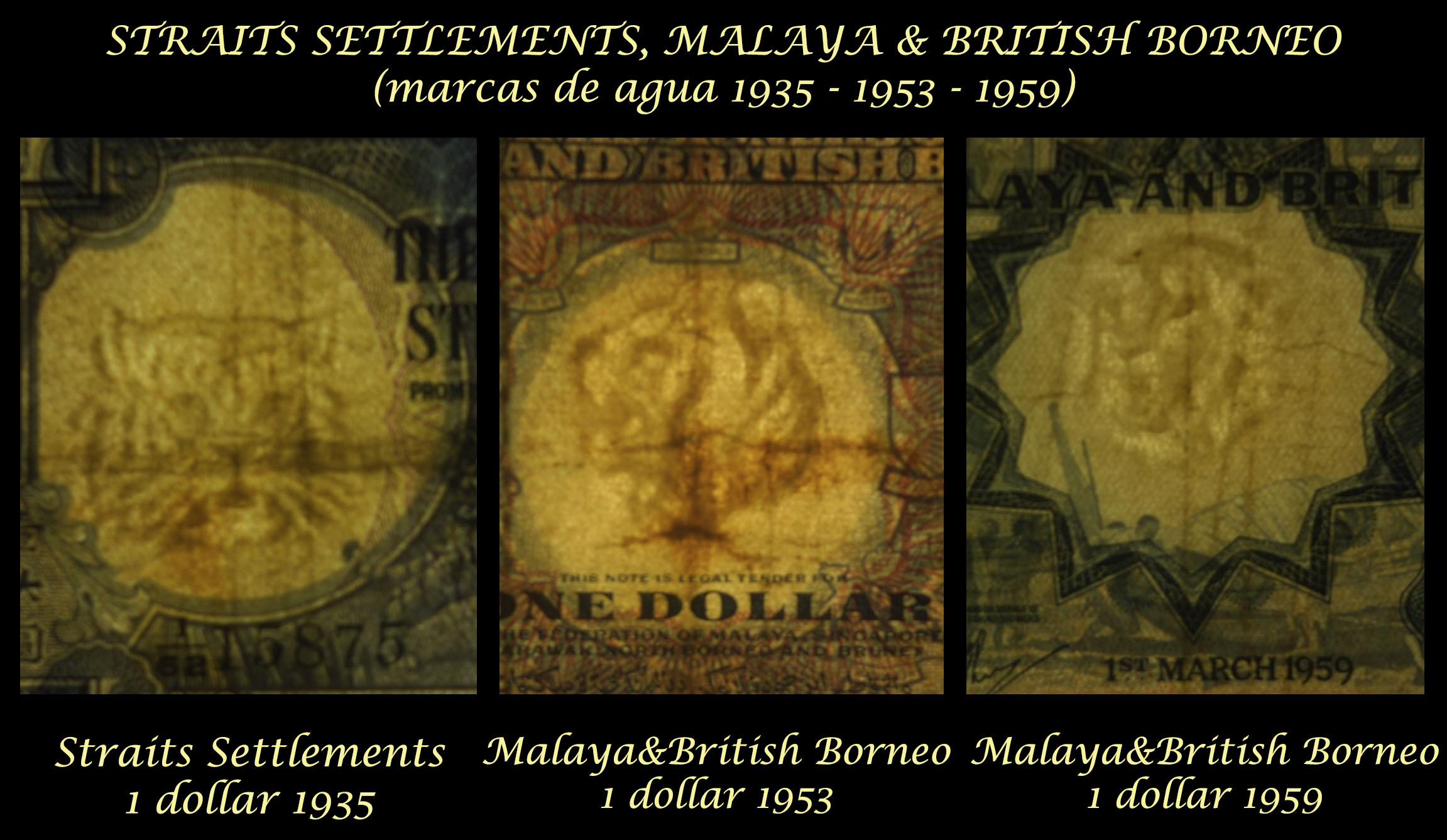 En cuanto a las marcas de agua, veremos desde una cabeza de tigre de frente en el billete de 1 dólar de los Straits Settlements de 1935 a una completamente de lado en el ejemplar de 1 dólar de Malaya & British Borneo de 1953 o a la cabeza ligeramente ladeada en el billete de 1 dólar de 1959.