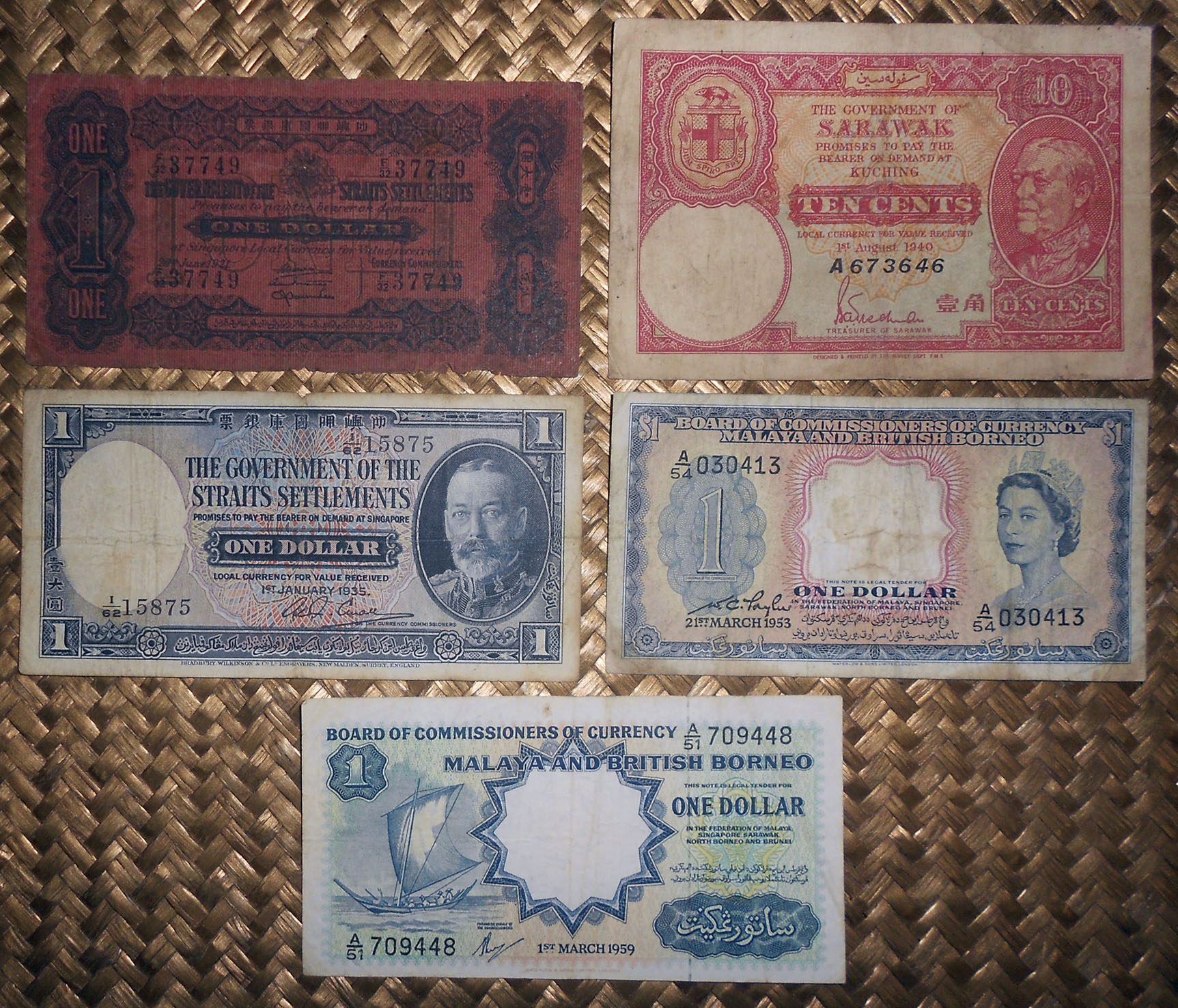 Contemplamos los ejemplares de 1 dólar de los Straits Settlements de 1921 y de 1935, el billete de 10 centavos de Sarawak de 1940 y los ejemplares de 1 dólar de Malaya & British Borneo de 1953 y de 1959. En sus grabados aparecerán desde los monarcas británicos Jorge V e Isabel II o el rajah Charles Brooke, hasta composiciones con dibujos heráldicos, escenas marítimas o el mismísimo tigre de Malasia. Fueron ediciones de diferentes imprentas, tanto europeas (Thomas de la Rue, Waterlow & Sons Ltd. o Bradbury, Wilkinson & Co. , las tres londinenses) como malayas ( Survey Dept. Fed. Malay States de Kuala Lumpur).