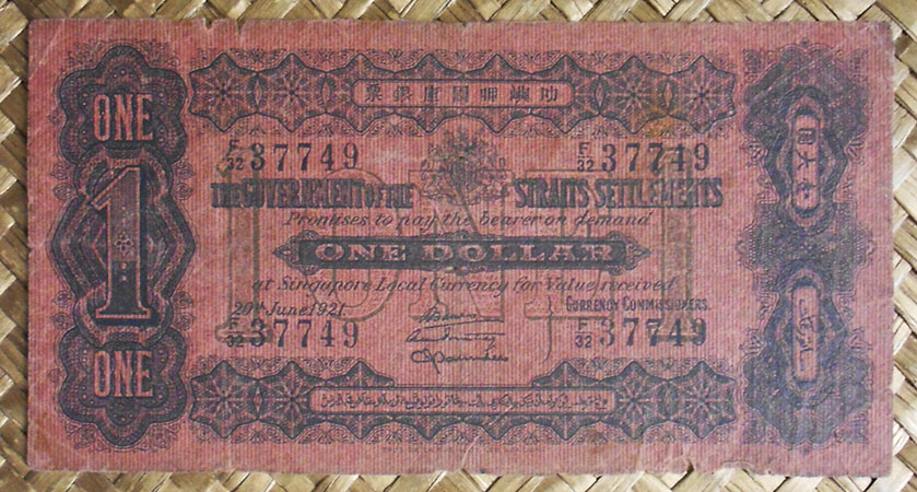 El billete de 1 dólar de los Straits Settlements de 1921 fue impreso en papel rojo con tinta negra por Thomas de la Rue & Co. Ltd. de Londres. Su valor en dólar, moneda común en todas las colonias británicas de Asia, cuando la moneda de uso en Gran Bretaña siempre fue la libra o pound. El cambio establecido en esa serie, iniciada en 1906, fue de 2 chelines con 4 peniques (2 shilling 4 pence) por cada uno de estos dólares. En 1921 el ST$ (Straits Settlements dollar) equivalía a 0.57 US$.