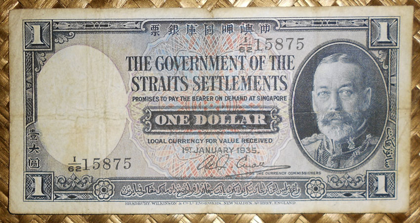 En orden cronológico comenzamos con los Straits Settlements o Asentamientos del Estrecho, de los que revisamos el billete de 1 dólar de 1921 y el ejemplar de 1 dólar de 1935. Estos territorios fueron una cesión de la Compañía Británica de las Indias Orientales en 1867 para su administración por el gobierno británico. Abarcaban los asentamientos de Malaca, Penang, Dinding y Singapur, pequeñas porciones territoriales de la península de Malaca (actual Malasia) inconexas entre ellas y rodeadas del resto de estados que pronto formarían la Unión Malaya. Con capital en Singapur, los Straits Settlements fueron disueltos en 1946, tras la ocupación japonesa y la creación de la Unión Malaya, que iba a incluir tanto sus territorios como el resto de estados de la península malaya.