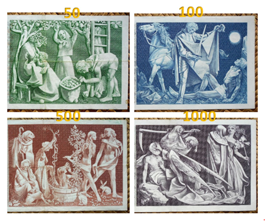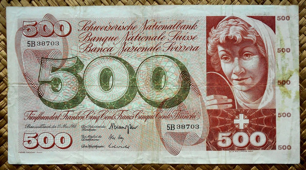 Vamos a contemplar los billetes de 50 francos suizos de 1973, 100 francos suizos de 1969, 500 francos suizos de 1968 y 1000 francos suizos de 1967. En todos ellos hay cierto paralelismo entre la representación retratística del anverso y la composición del reverso.