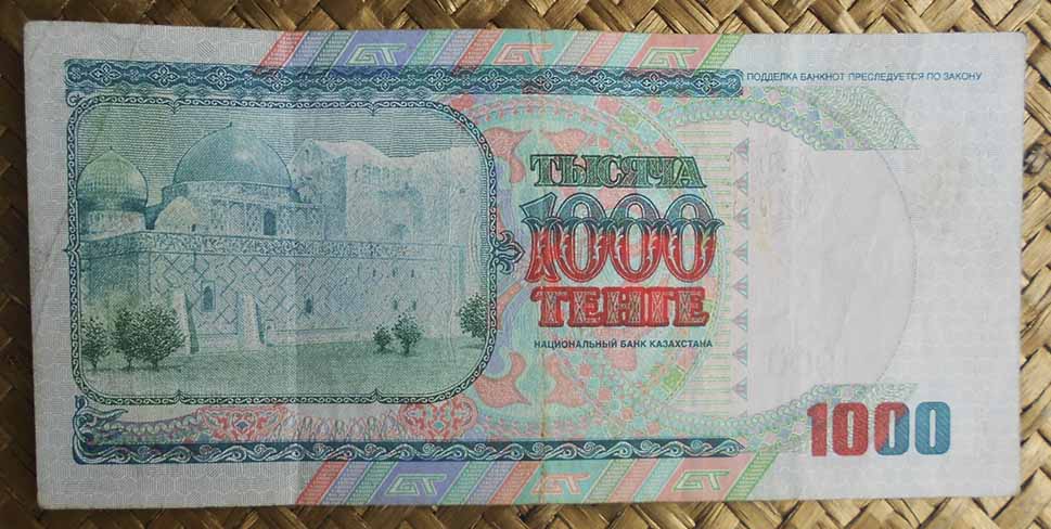 El billete de 1000 tenges de Kazajistán de 2000 nos presenta el Mausoleo en vista completa lateral.