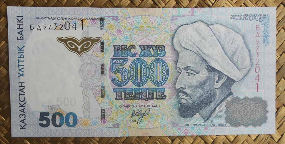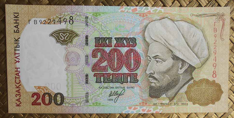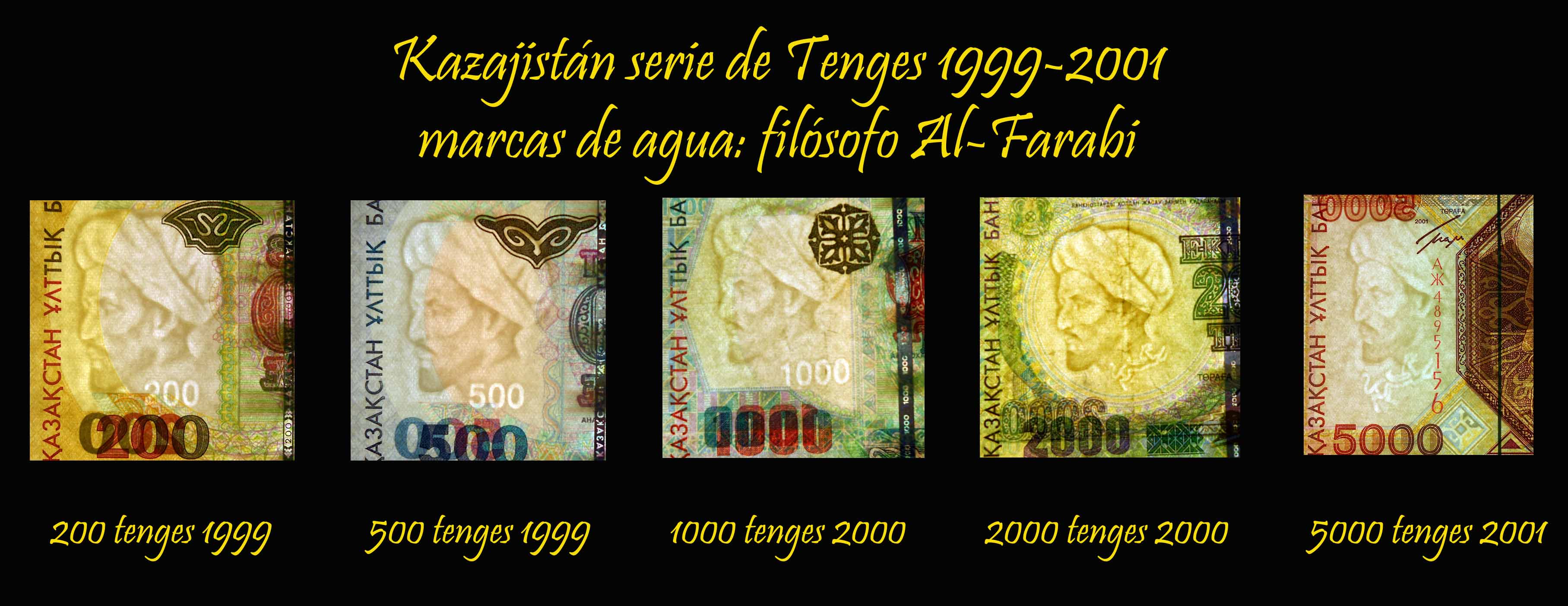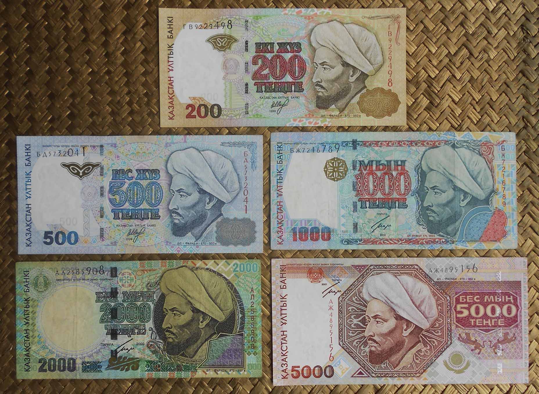 Todos ellos nos ofrecen en su anverso la cabeza y torso de Abu Nasr Al-Farabi, filósofo del s.IX primero en difundir al mundo árabe la filosofía de Platón y Aristóteles. Sus textos en ruso excepto en el reverso del de 200 tenges que también lo expresa en kazajo. Sus tonalidades, verde amarronado para el de 200 tenges, azul oscuro y violeta para el de 500 tenges, verde y rojo para el de 1000 tenges, verde y marrón para el de 2000 tenges y marrón y violeta para el de 5000 tenges.