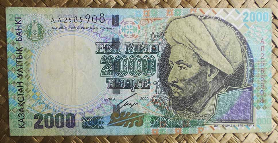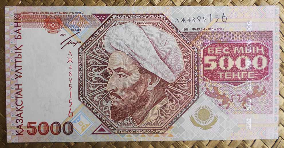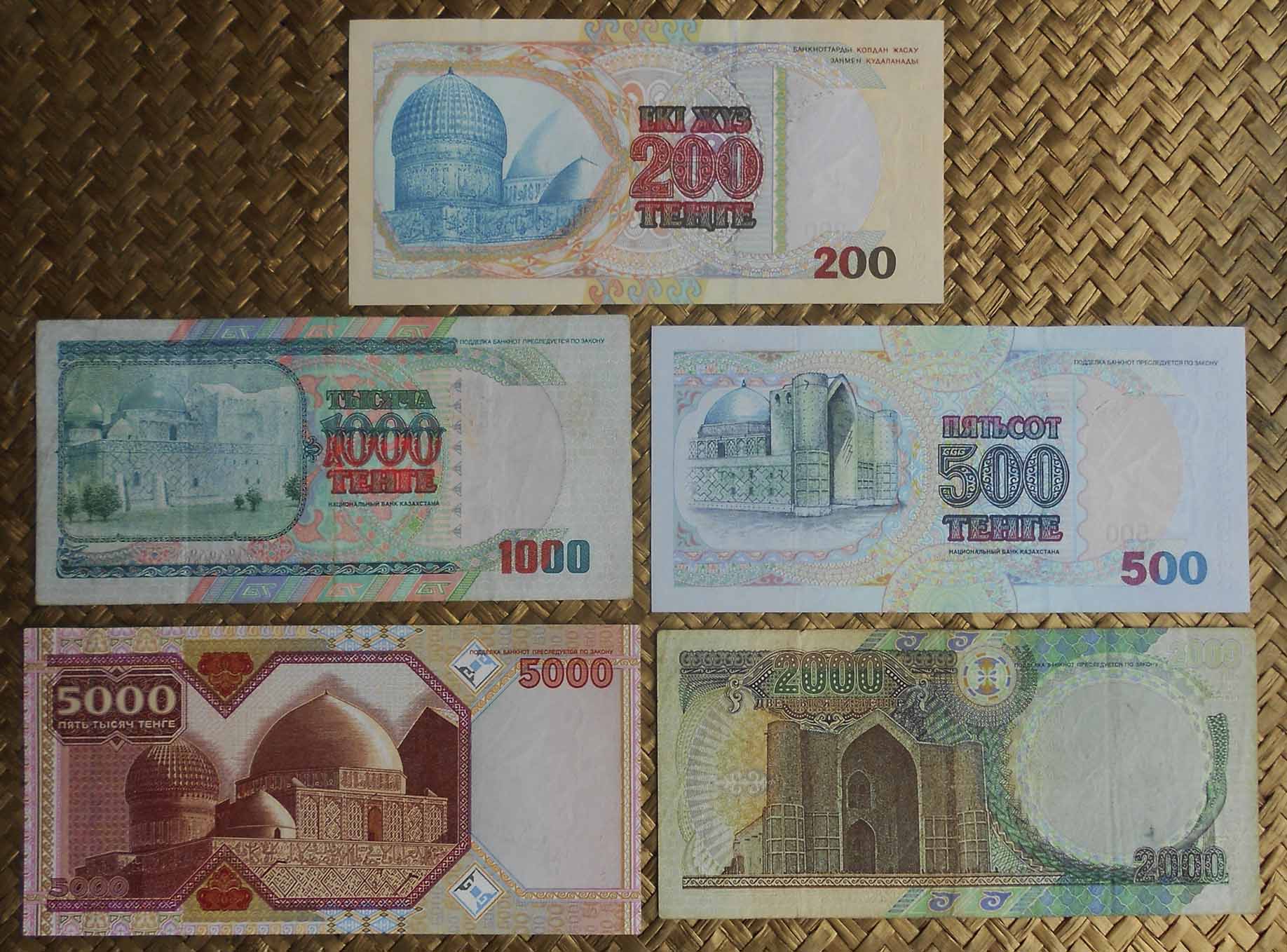 Contemplaremos casi toda la 2ª emisión del Kazakhstan National Bank a inicios de s. XXI. Se muestra el billete de 200 tenges de 1999, el billete de 500 tenges de 1999, los billetes de 1000 y 2000 tenges del año 2000 y el billete de 5000 tenge del 2001.