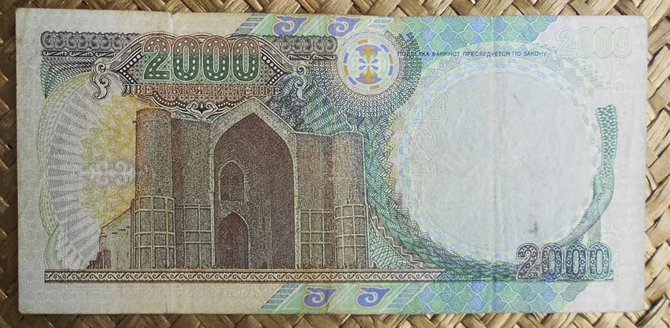 El billete de 2000 tenges de Kazajistán de 2000 nos reproduce la gran puerta de entrada del Mausoleo, de arco llamado “pishtak”, sus frontones y torres.