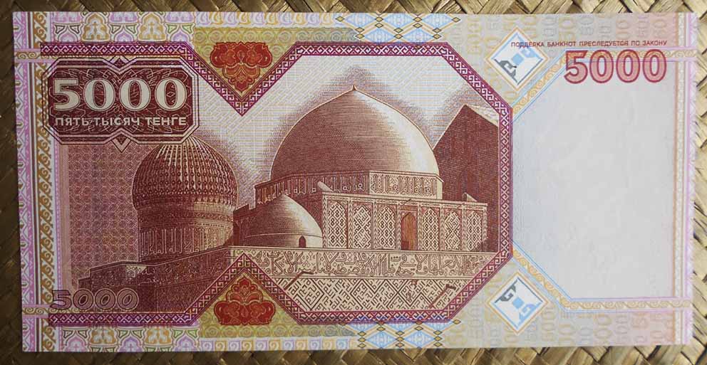 El billete de 5000 tenges de Kazajistán de 2001 nos muestra nuevamente una vista de las distintas cúpulas del Mausoleo, siendo su cúpula central la más grande de Asia Central.
