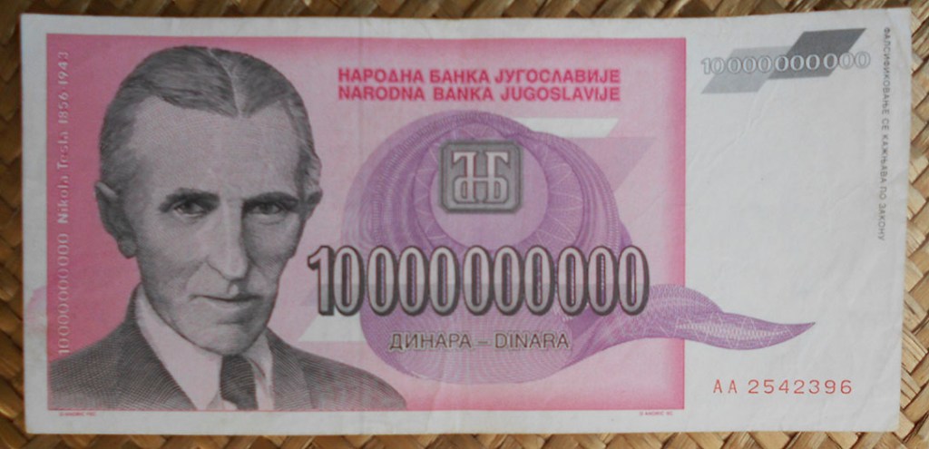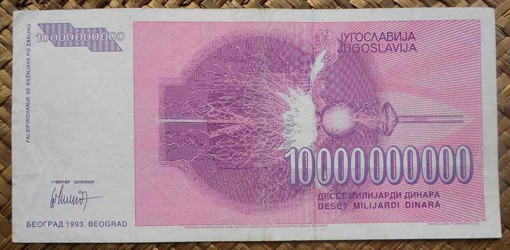 En el billete de 10.000.000.000 dinares de Yugoslavia de 1993 volvemos a contemplar al Tesla maduro en su anverso y la bobina de Tesla y sus arcos eléctricos verticalmente sobre el reverso. Misma marca de agua que el anterior y otro reflejo hiperinflacionista del billetario yugoslavo.