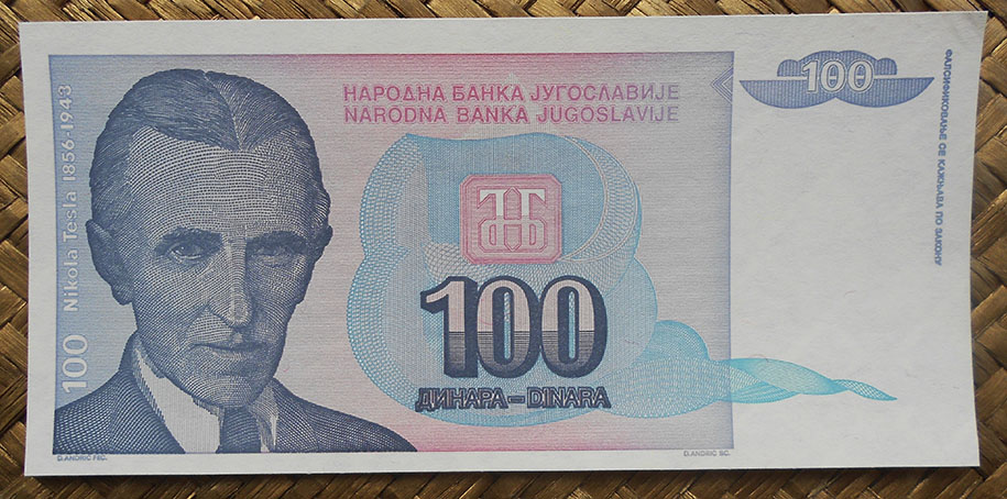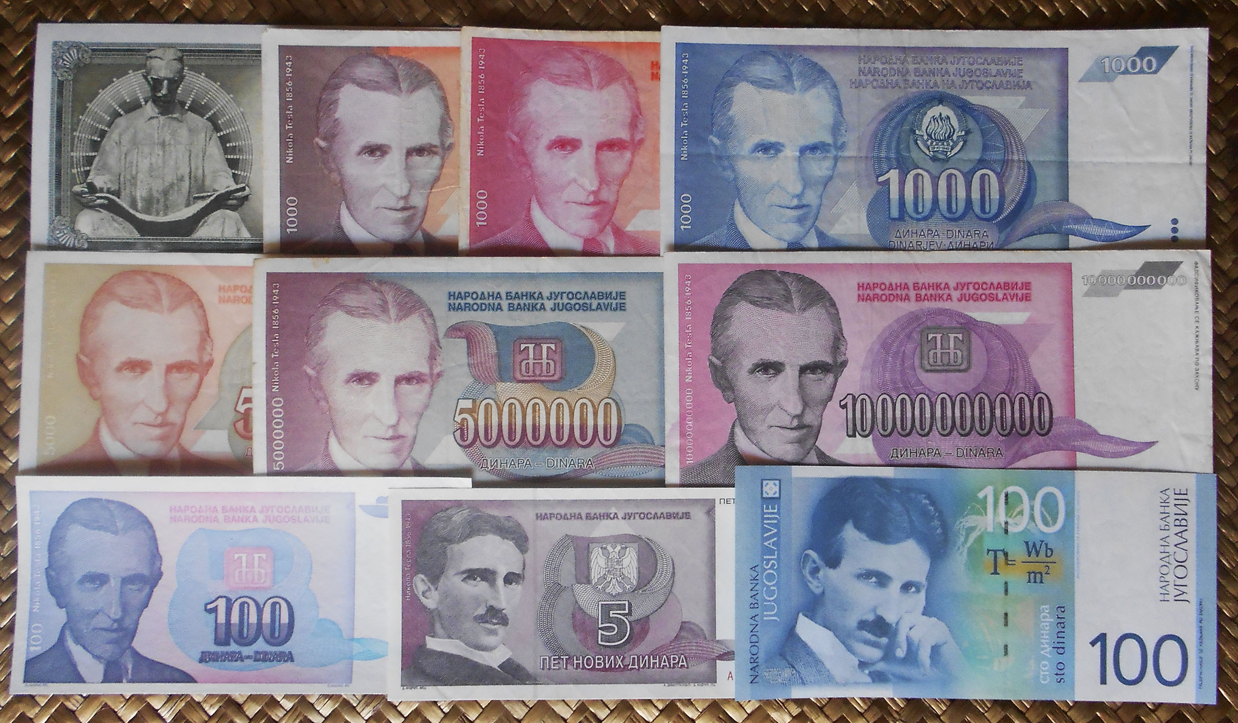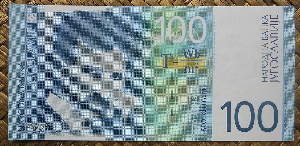 El billete de 100 dinares de Yugoslavia de 2000 nos ofrece en el anverso a un joven Tesla pensativo, con la barbilla apoyada en su mano junto a la ecuación física de su descubrimiento (T=wb/m2), la inducción magnética (Tesla) o densidad de flujo magnético, como flujo magnético (weber=Wb) por unidad de superficie (metro cuadrado=m2). Su reverso es para una composición vertical de otra foto suya, el escudo de armas yugoslavo y un esquema unifilar eléctrico de su motor de inducción. Su marca de agua, el rostro de Nikola Tesla joven.